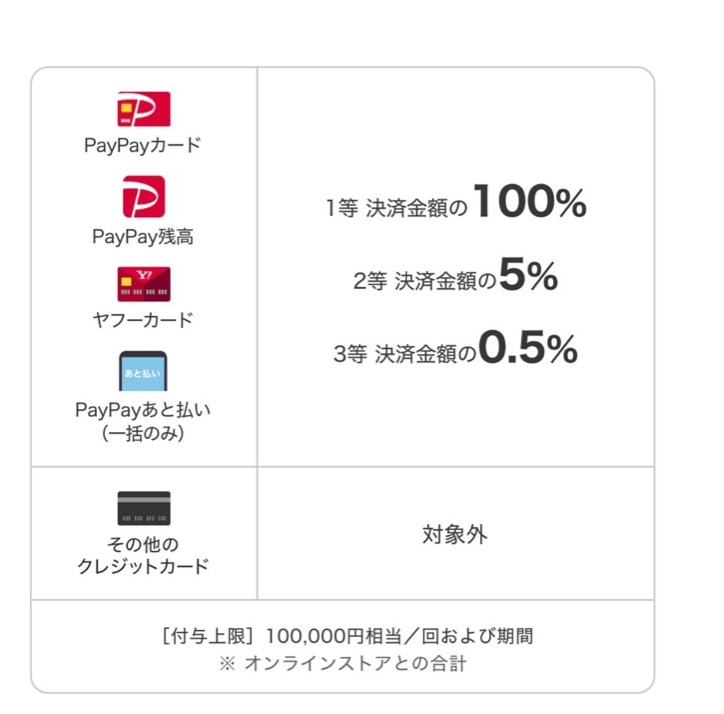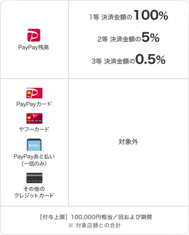 1等当選者には最大で決済金額の全額(100%)、2等当選者には最大で決済金額の5%、3等当選者には最大で決済金額の0.5%のPayPayボーナスを付与します。なお、付与上限は100,000円相当/回、100,000円相当/期間。一方、超PayPay祭 対象加盟店で超おトクキャンペーンの対象加盟店やキャンペーン内容の詳細については後日公表予定のお知らせにてご確認ください。
