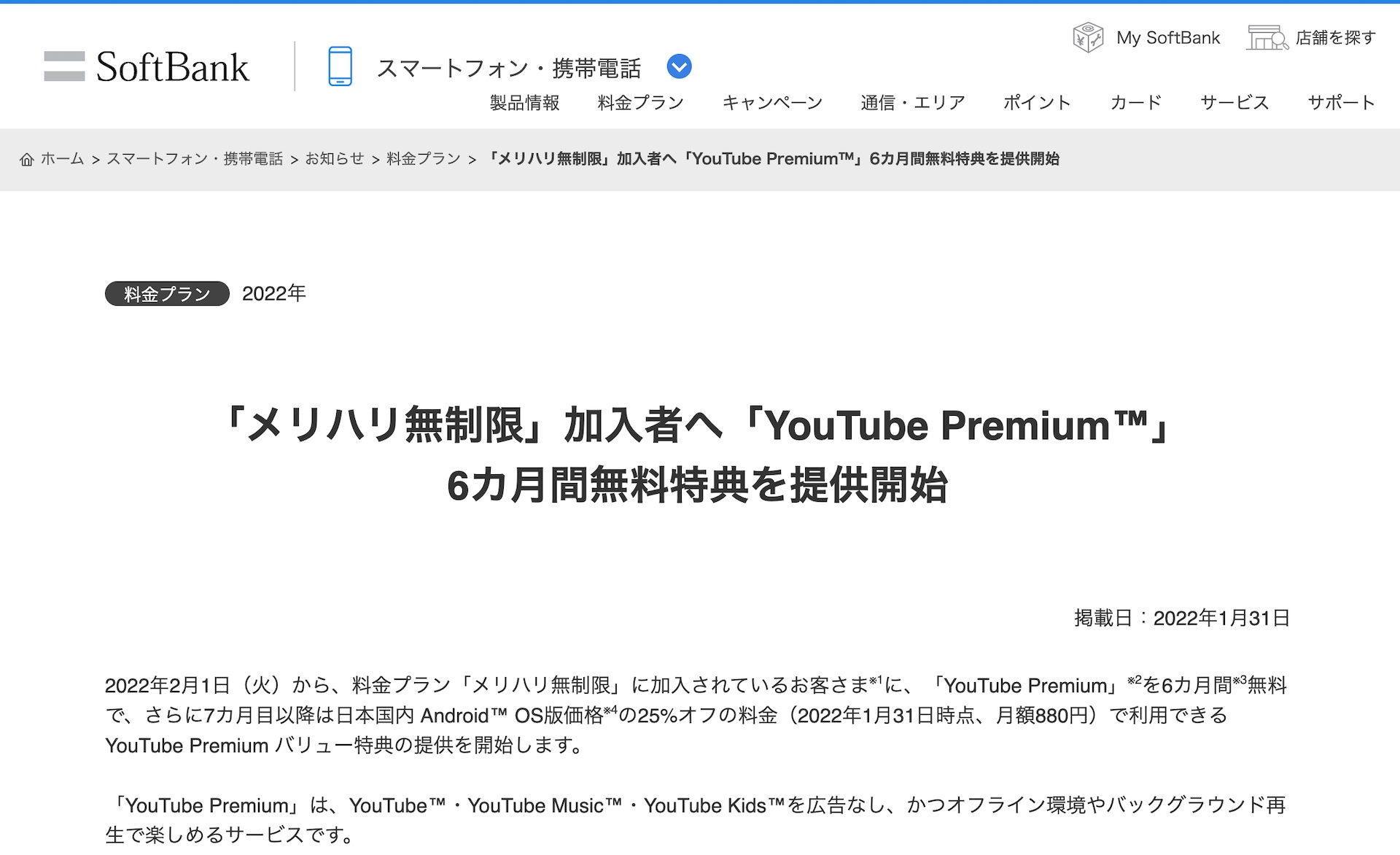 ・「メリハリ無制限」加入者へ「YouTube Premium」6カ月間無料特典を提供開始 | スマートフォン・携帯電話 | ソフトバンク
