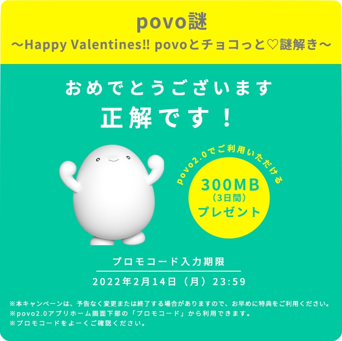 キャンペーンではキャンペーンWebページ( https://povo.k-digitallife.com/chocotto/ )にて出題されている謎解きに参加・正答した場合にデータボーナス「300MB(3日間)」のプロモコードが表示されるので、スマートフォン(スマホ)など向けアプリ「povo」にてこのプロモコードを適用すると、高速データ通信容量300MBが追加されます。