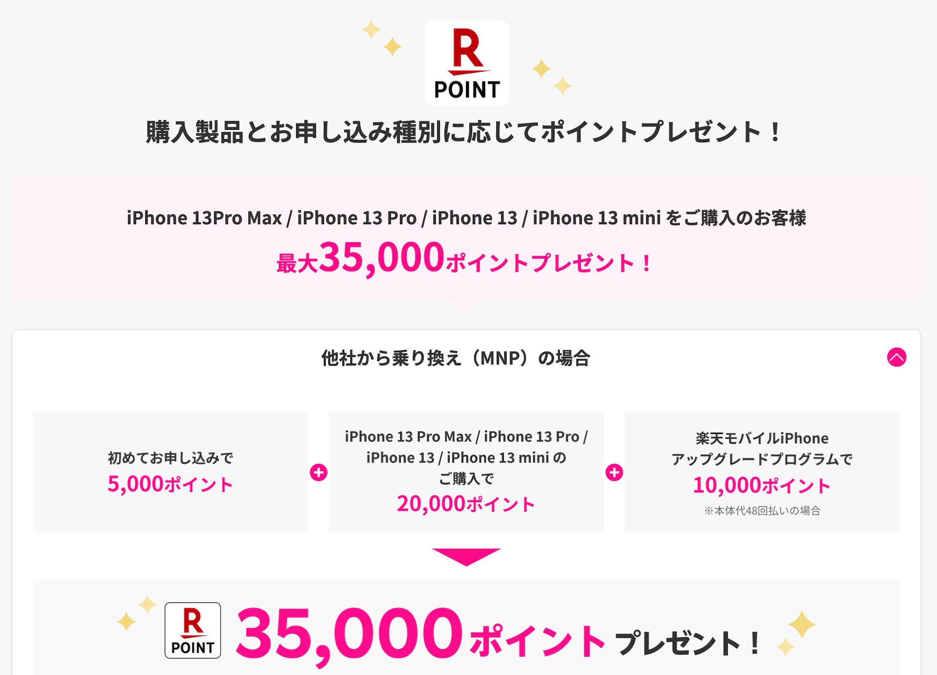 さらにRakuten UN-LIMIT VIとセットで購入する場合にはiPhone 13シリーズは他社から乗り換え(MNP)で20,000ポイント、新規契約およびプラン変更(移行)で10,000ポイント、iPhone 12シリーズはMNPで15,000ポイント、プラン変更(移行)で5,000ポイントが還元され、初めてRakuten UN-LIMIT VIを契約するとプレゼントされるポイントと合わせて合計で最大35,000ポイントがもらえます。