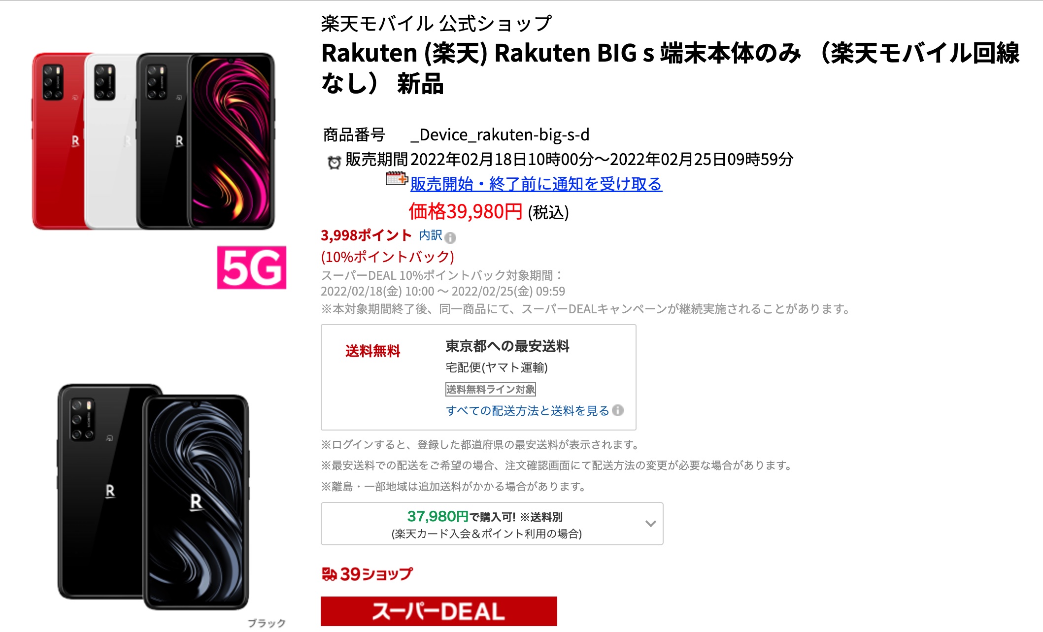 これにより、Rakuten Handは販売価格(金額はすべて税込)が12,980円の20%(2,596ポイント)還元で実質10,384円、Rakuten BIG sは販売価格が39,980円の10%(3,998ポイント)還元で実質35,982円となっており、さらにSPUなどによって還元額が上がります。なお、両機種ともに単体(白ロム)販売となっています。
