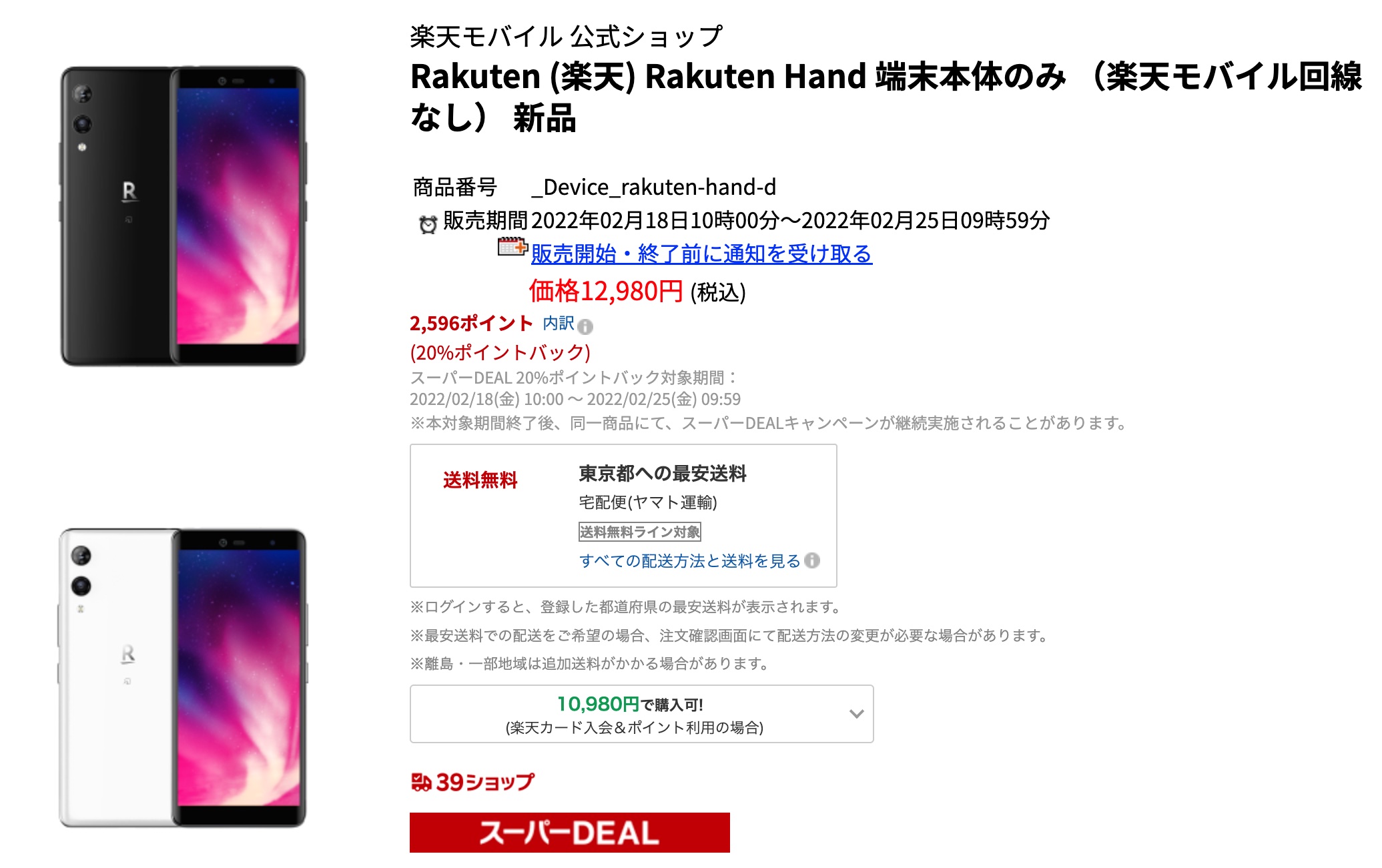 楽天モバイルが総合Webモール「楽天市場」にて展開する「楽天モバイル公式 楽天市場店」にてオリジナルスマートフォン(スマホ)「Rakuten Hand(型番:P710)」および「Rakuten BIG s(型番:3917JR)」を2022年2月18日(金)10:00から2月25日(金)9:59まで楽天スーパーDEALによって最大20%分の楽天ポイントを還元しています。