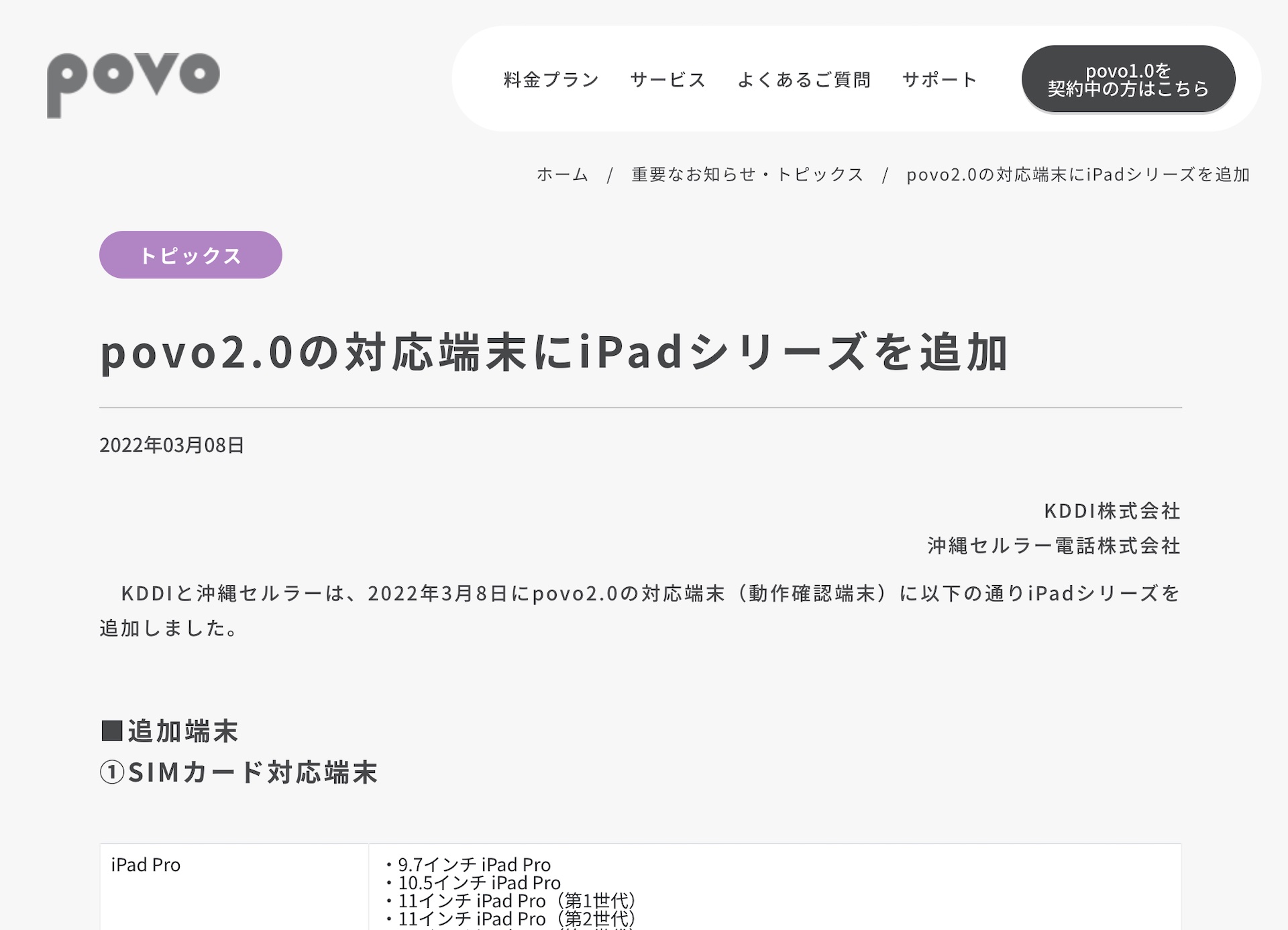 povo2.0の対応端末(動作確認端末)にiPadシリーズを追加しました!