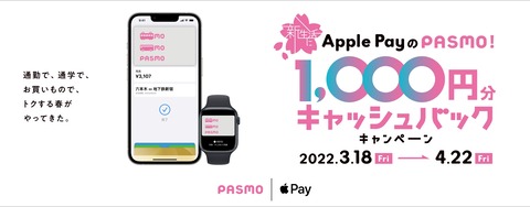 PASMO協議会およびパスモは15日、非接触IC機能「FeliCa」による交通・電子マネーサービス「PASMO」において「新生活に Apple Pay のPASMO! 1,000円分キャッシュバックキャンペーン」( https://www.pasmo.co.jp/cb/ )を2022年3月18日(金)10:00から4月22日(金)23:59まで実施するとお知らせしています。