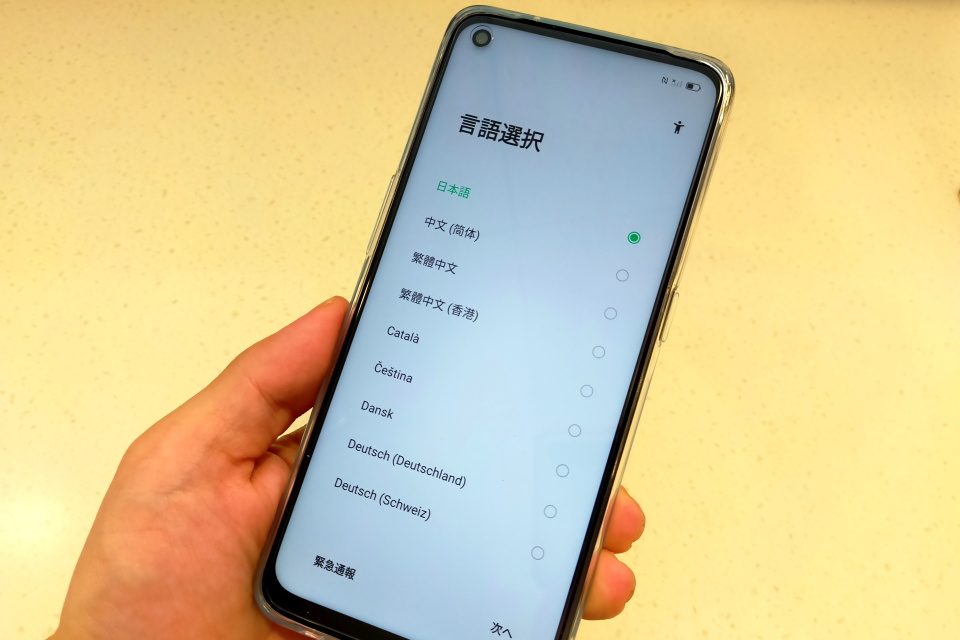 「設定」の画面で「SIMカードおよびモバイルデータ」をタップするとSIM情報とSIMの設定ができる画面に推移する。OPPO Reno5 A(eSIM)では物理SIM(SIMカード)の他にeSIMにも対応しており、この「SIMカードおよびモバイルデータ」の画面にも「eSIM」の項目がある。「eSIM」をタップすると推移した画面では「eSIMがありません」と表示され、その下に「追加」ボタンがある。eSIMを設定する場合はこの「追加」ボタンをタップして画面の指示に従って進めていく。