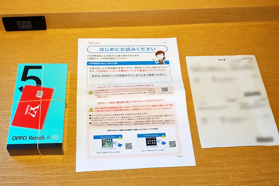 段ボールの中には、OPPO Reno5 A(eSIM)の個装箱と輪ゴム2本で止められたSIMカードの他、「はじめにお読みください」の冊子と、「納品書」および「返品連絡票」の用紙が1枚入っていた。