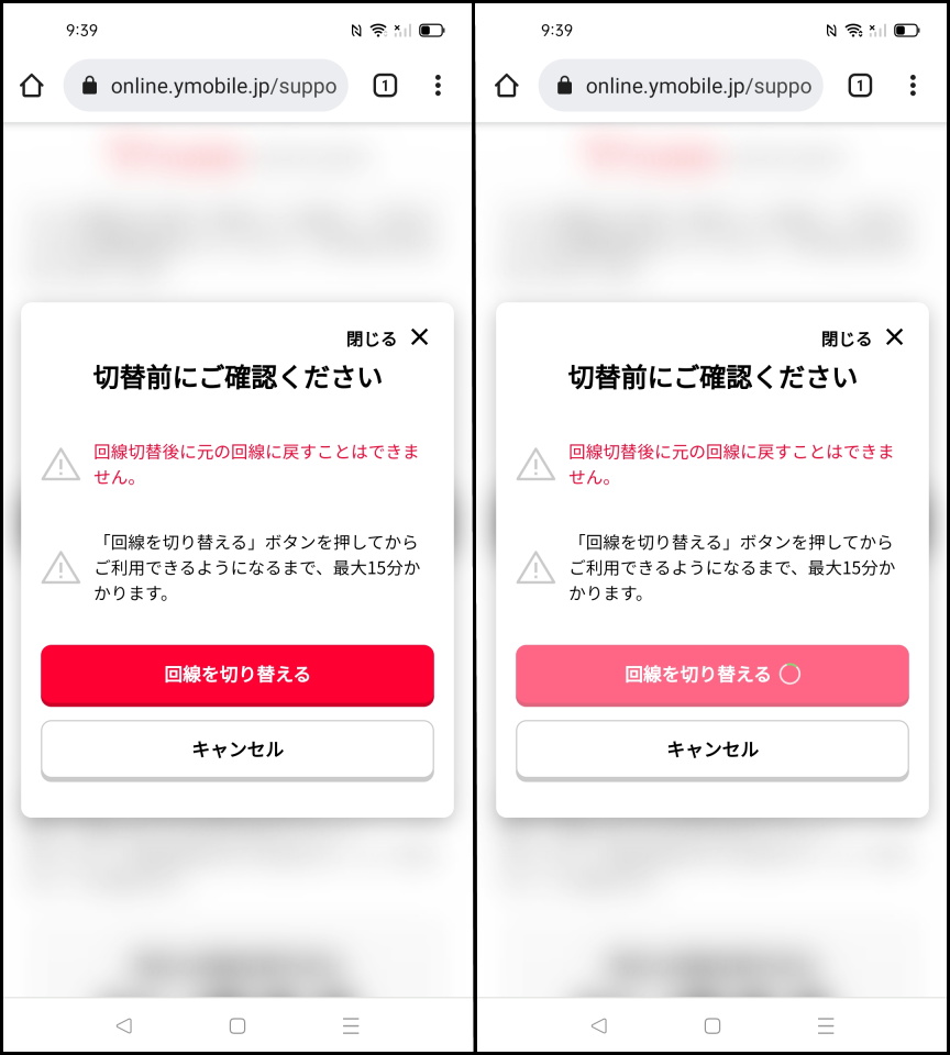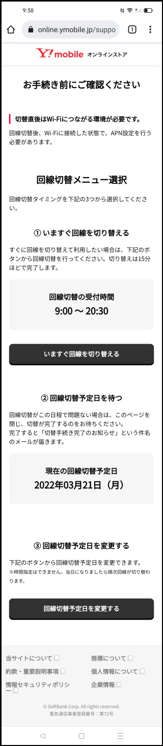 その後、推移した画面では「My Y!mobile ログイン」のボタンをタップしてIDとパスワードを入力してログインする。「お手続き前にご確認ください」の画面で「今すぐ回線を切り替える」をタップする。9:00~20:30までの時間であればすぐに回線を切り替えることが可能だ。