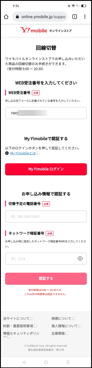 「回線切替」と記載された専用ページにアクセスできたらYWOから始まる「WEB受注番号」を入力する。YMOと間違えないように(筆者は間違えた)。