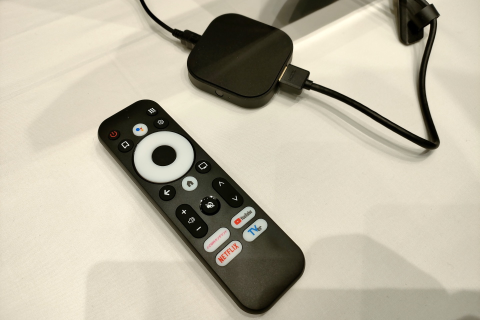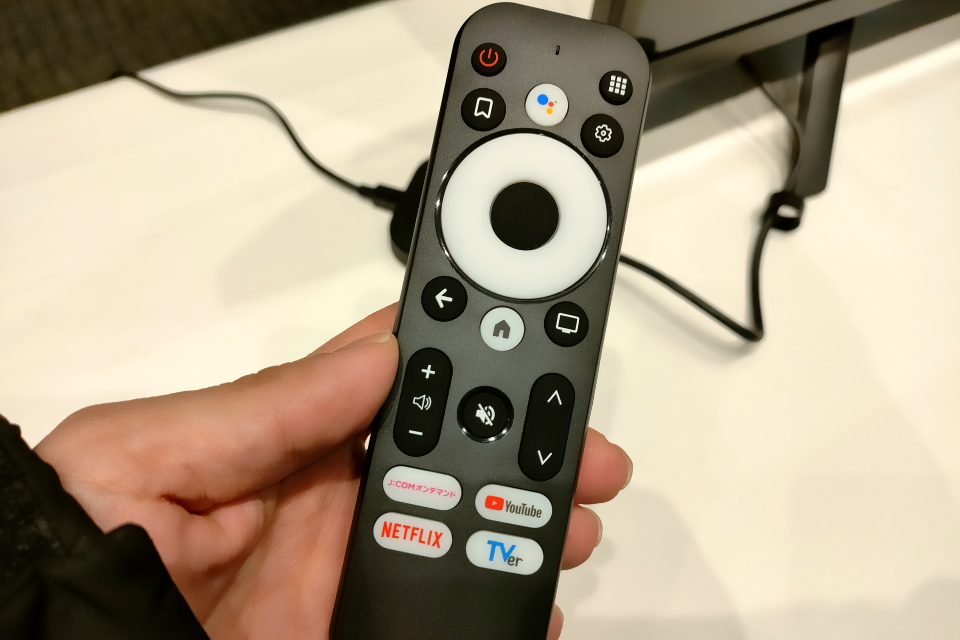 リモコンは、方向キーや電源ボタン、ホームボタンのほか、Googleアシスタント、J:COMオンデマンド、YouTube、NETFLIX、Tverの専用ボタンも搭載している。