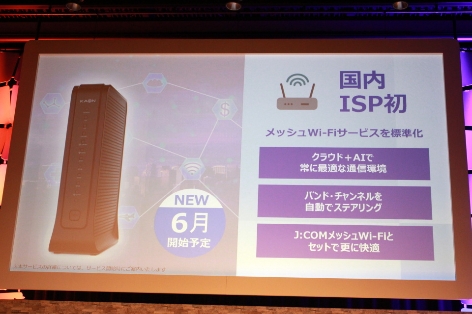 井村氏は新ブランドメッセージである「あたらしいを、あたりまえに」を体現するための新しいサービスについても説明した。既にサービスを展開している「J:COM メッシュWi-Fi」においては、国内ISPとしては初となるメッシュWi-Fi機能搭載のモデムをインターネットサービス向けに標準化するとし、6月に開始する予定だ。