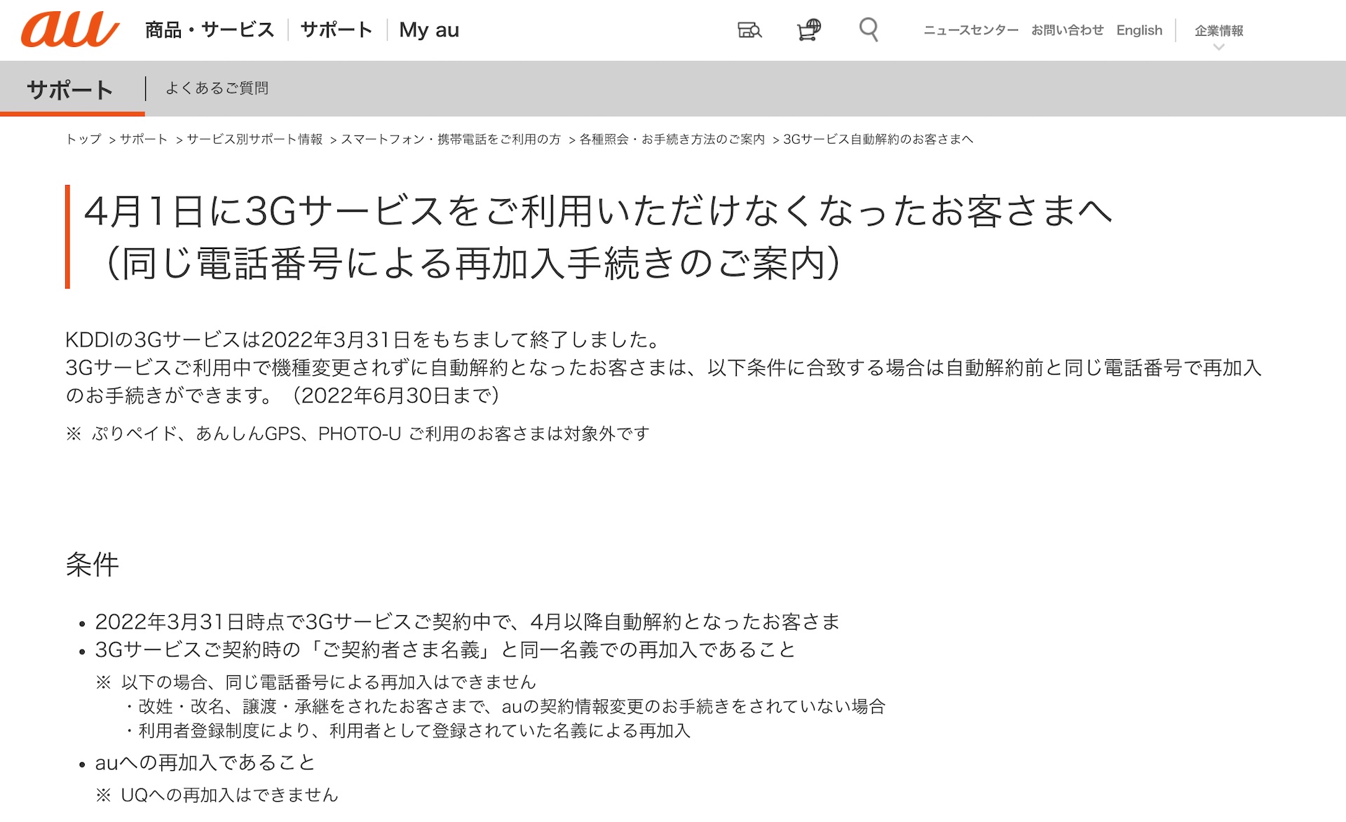 ・4月1日に3Gサービスをご利用いただけなくなったお客さまへ(同じ電話番号による再加入手続きのご案内) | スマートフォン・携帯電話をご利用の方 | au