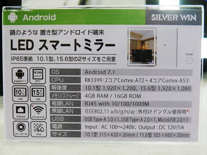 本イベントレポートの3本目はAndroidやWindows(タブレット・ノート)端末といったの中古売買やOEM生産(ざっくりと説明すると、外部からの委託を受けて生産を担当する事業)などを行っているメーカーのシルバーウィンのメーカーに展示されていたAndroidを搭載した鏡「LED スマートミラー」が展示されていたので紹介します。