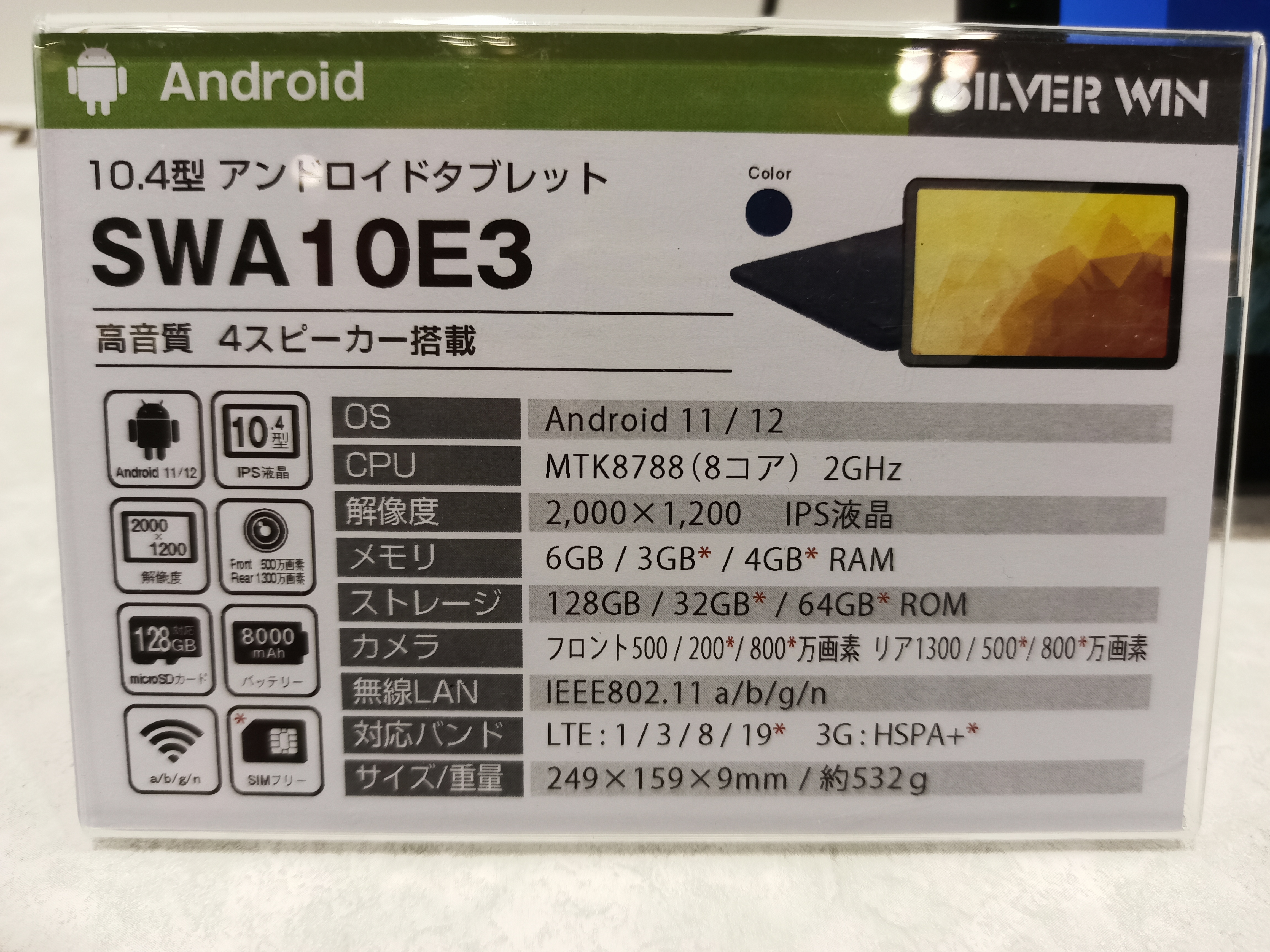 SWA10E3のスペックシート。SoCはMediaTek製のMtk8788(2Ghz × 8コア)と2019年発売のモデルで性能はそこそこ