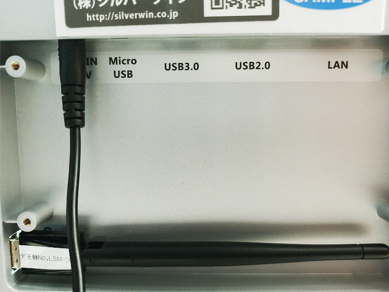 本機は内蔵バッテリーなどは搭載しておらず、専用ACアダプタを使って電源の供給を受けるようになっているほか、ネットワーク接続については、LANケーブルを接続して利用する形となります。(オプションとしてWi-Fiユニットがあり、上の画像では背面側に横向きにWi-Fi用アンテナが接続されているのが確認できます。)
