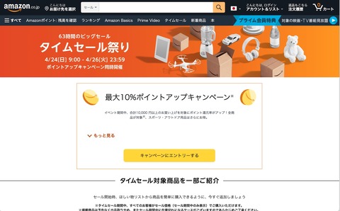 | 63時間のAmazonタイムセール祭りが4月24日9時にスタート!ポイントアップキャンペーンも実施中 |