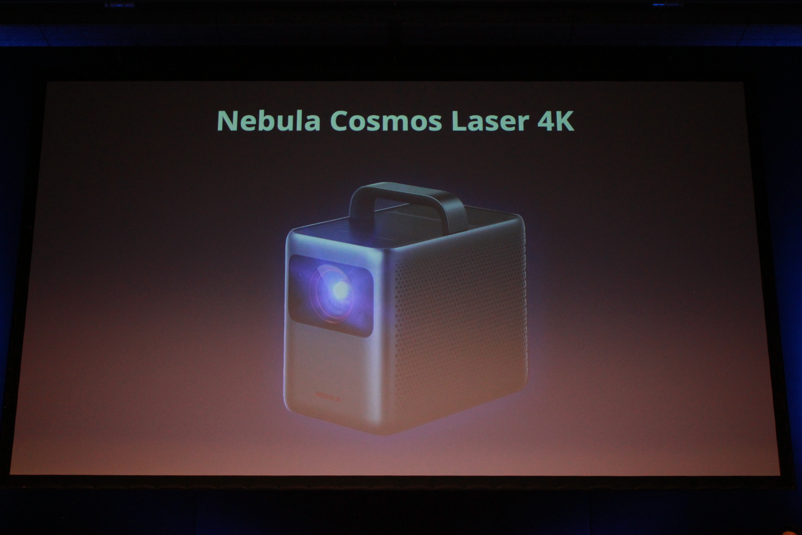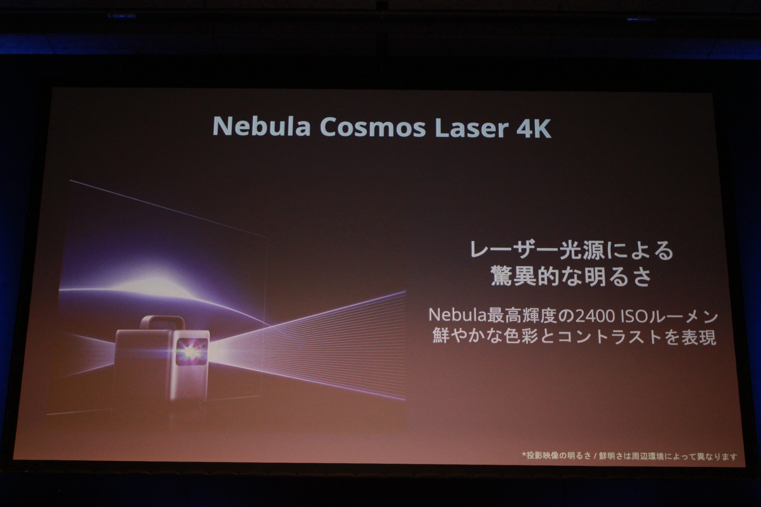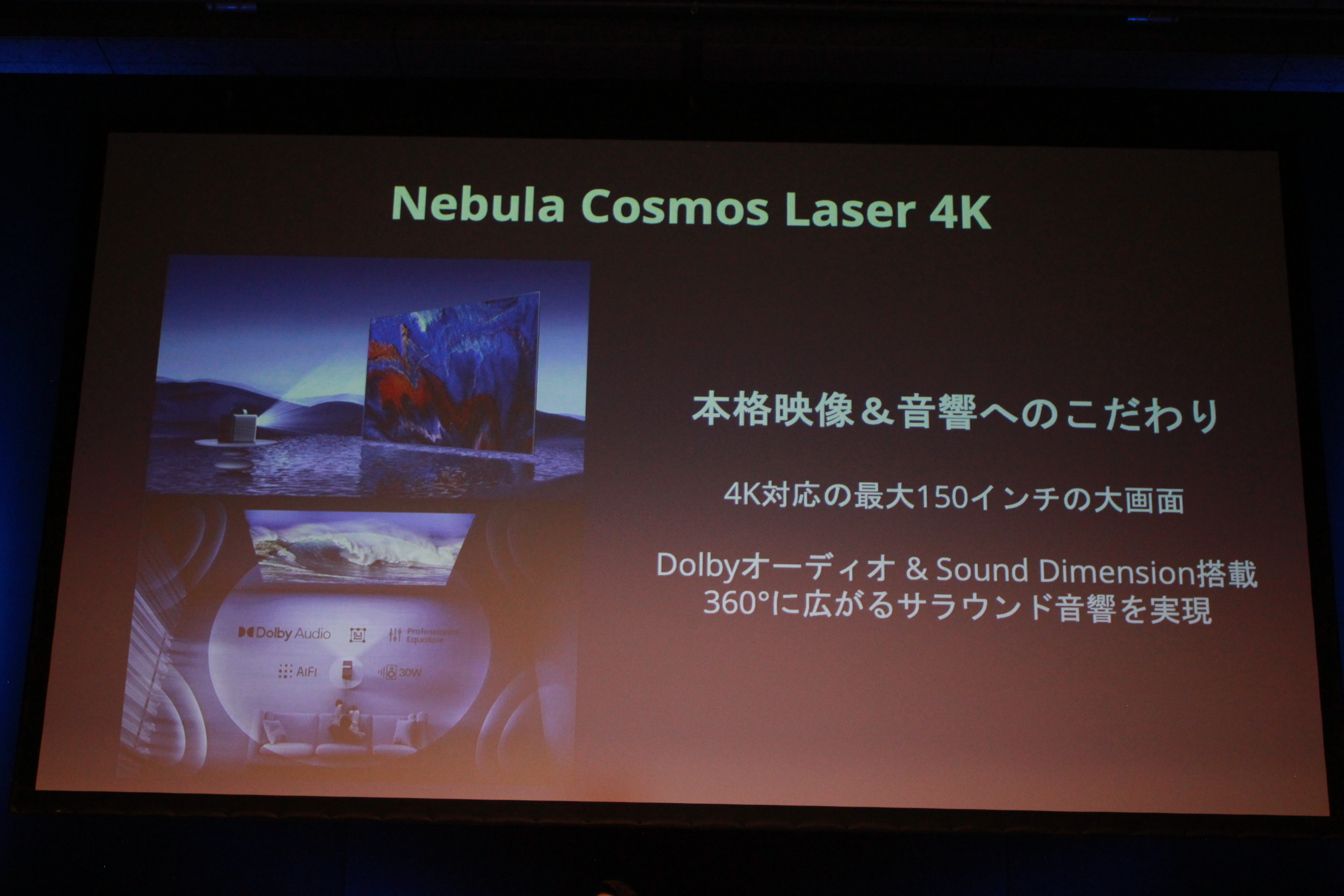 続いて発表されたのは、Nebulaシリーズで最上位モデルとなる「Nebula Cosmos Laser 4K(ネビュラ コスモス レーザー フォーケー)」だ。シリーズ初となるレーザー光源を採用し、最大150インチかつ4K(3840×2160)対応で圧倒的な没入感を実現する。