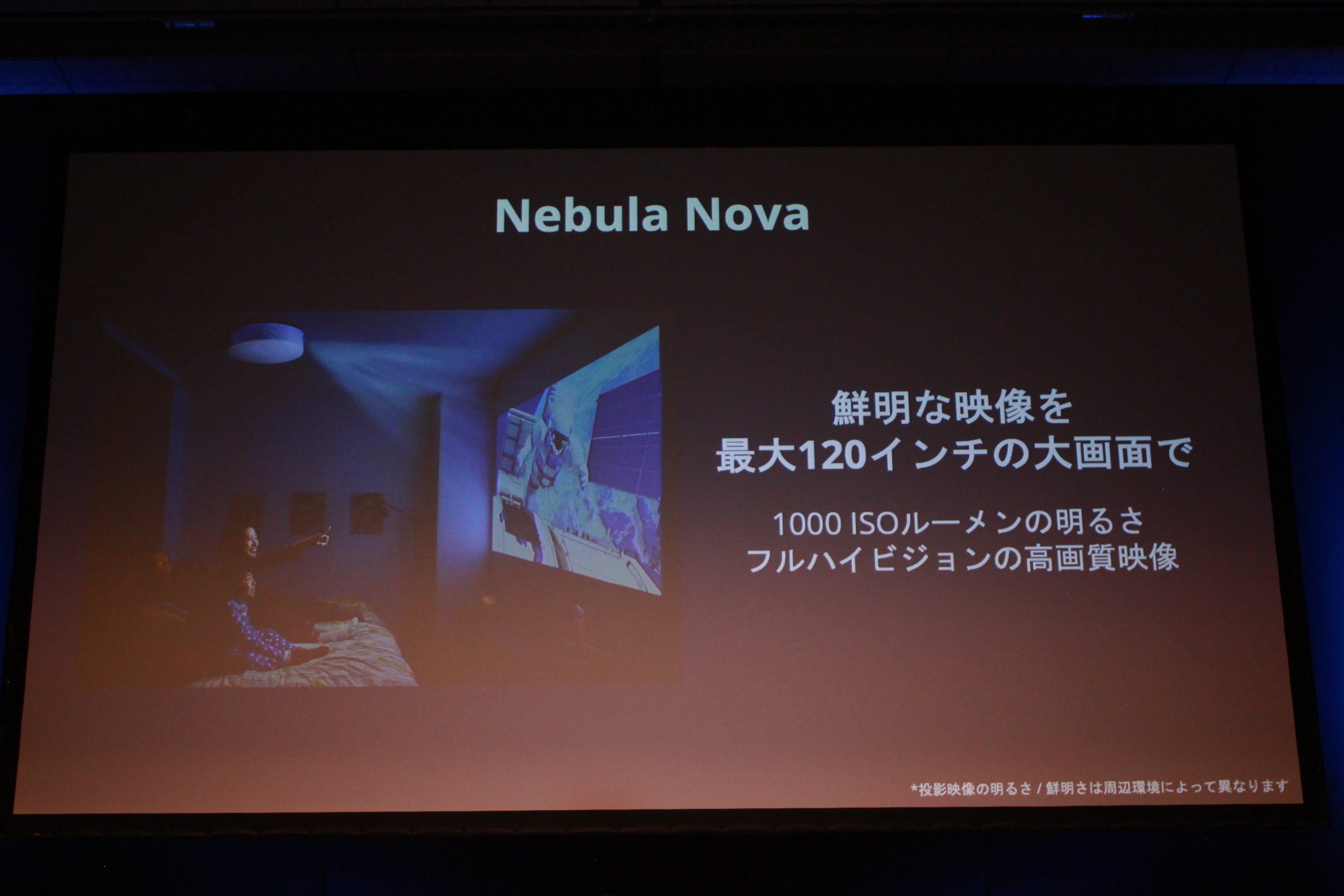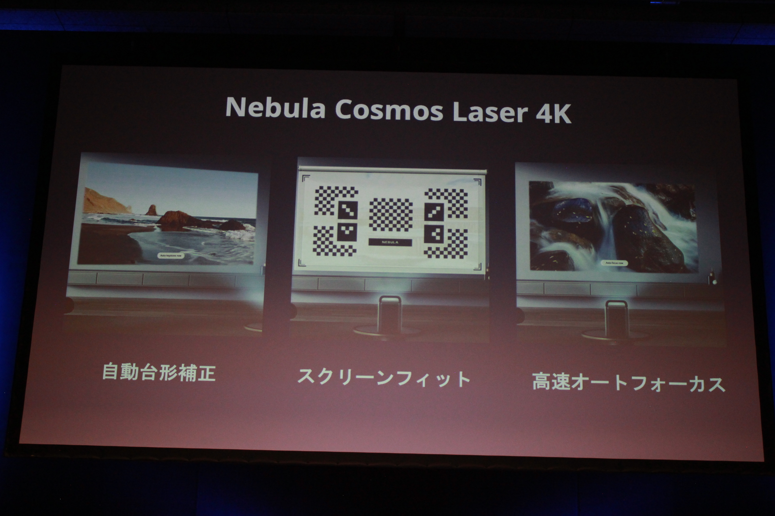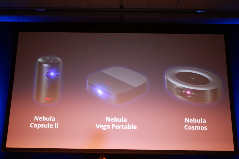 続いて発表されたのは、Nebulaシリーズで最上位モデルとなる「Nebula Cosmos Laser 4K(ネビュラ コスモス レーザー フォーケー)」だ。シリーズ初となるレーザー光源を採用し、最大150インチかつ4K(3840×2160)対応で圧倒的な没入感を実現する。