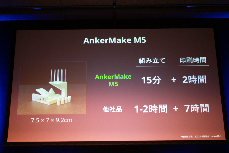 吉野氏によると、近年DIY(Do It Yourself)の需要が高まる中、家庭においても、ものづくりを楽しむ人が増えているとのことで、それに伴って3Dプリンターの需要も高まっているという。しかし、3Dプリンターには「長い待ち時間」「仕上がり」に対する不満も多いそう。そこでAnkerでは、家庭用3Dプリンターへの参入を決め「AnkerMake M5(アンカーメイク エムファイブ)」を今年の冬に発売する予定だ。予定販売価格(金額はすべて税込)は99,990円。