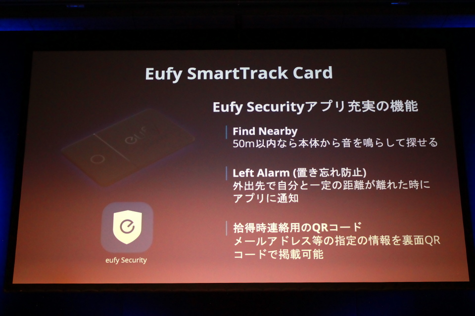 Eufy Securityでは、これまでインドアカメラなど見守りの対象が「家」だったが、今回、身の回りの大切なアイテムを対象にしたスマートトラッカーをラインナップに追加する。「Eufy SmartTrack Card(ユーフィ スマートトラック カード)」は、クレジットカードと同じサイズであり、厚みも約2.4mmととても薄いため、財布に入れておくことができる紛失防止端末。