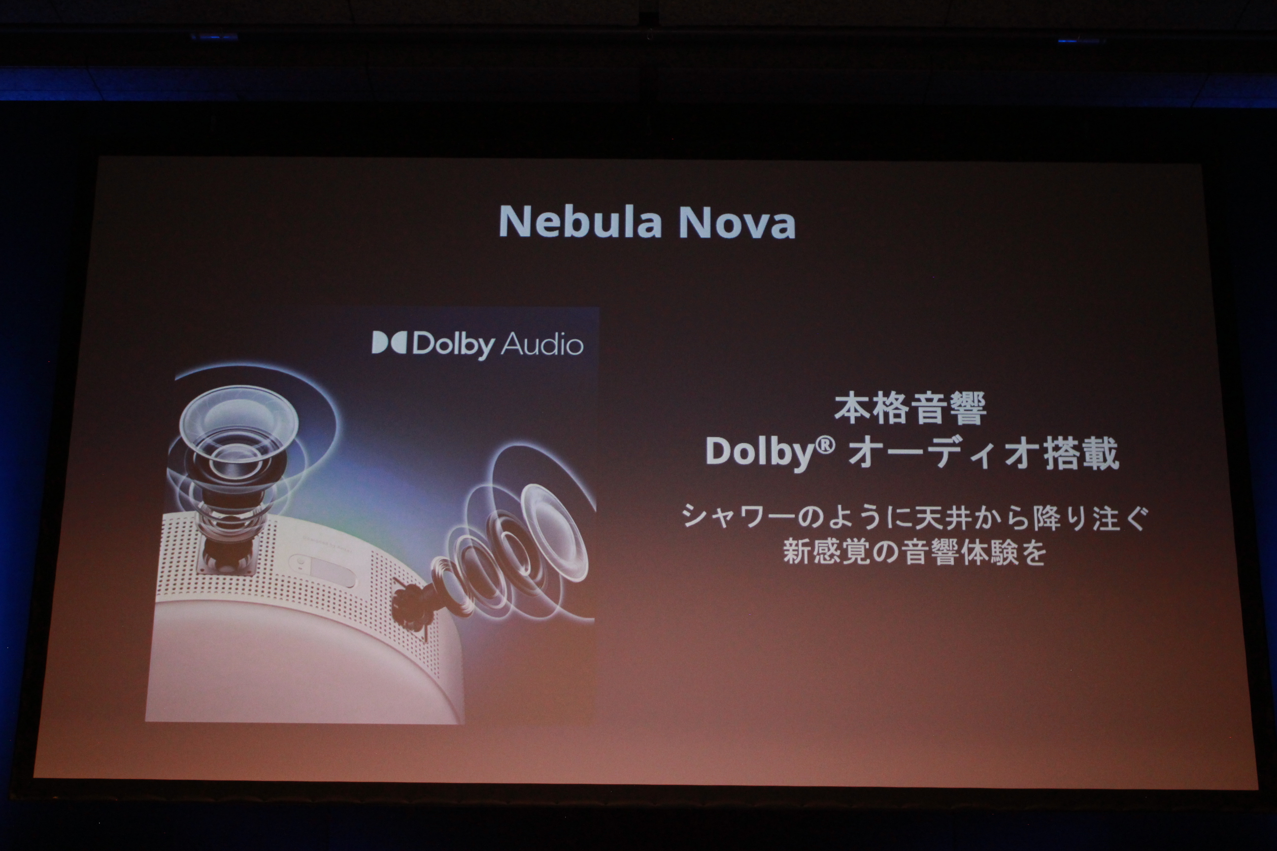 Nebulaの新シリーズとして発表されたのが、世界初Android TV 9.0を搭載したシーリングプロジェクターだ。YouTubeやNetflix、Prime Video、TVer、Disney+をはじめ3600以上のアプリが利用できるだけでなく、最大120インチでフルハイビジョン(1920×1080)の高画質映像の投影が可能。また、Nebulaとしては初めての単焦点プロジェクターとなっており、本体から壁が近い部屋でも大画面で綺麗な映像が楽しめる。