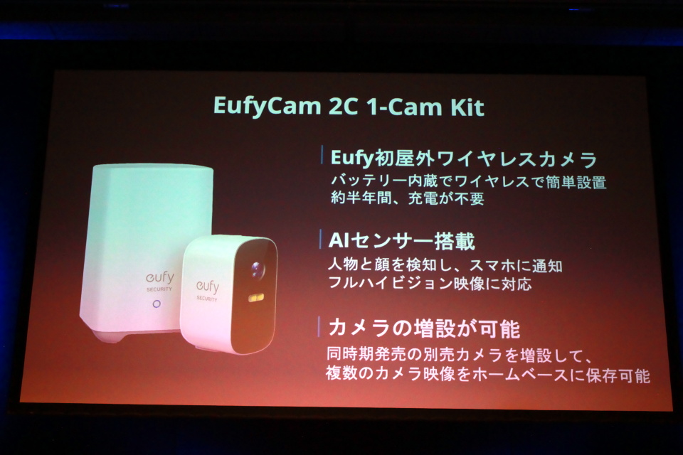Eufy初の屋外ワイヤレスバッテリーカメラ「eufyCam 2C 1-Cam Kit(ユーフィカム ツーシー ワンカム キット)」は、バッテリー内蔵タイプで約半年間充電が不要なほか、AIセンサーで人物や顔を検知してスマホに通知、フルハイビジョン映像での記録、カメラの増設や、複数カメラの映像をホームベースに安全に保存できることなどが特徴。今年の夏頃発売予定で、予定販売価格は19,990円。増設用の別売りカメラ「eufyCam 2C Add-on Camera(ユーフィカム ツーシー、アドオン カメラ)」は11,990円の予定。