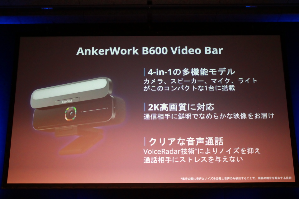 既存のラインナップに加え、新製品「AnkerWork B600 Video Bar」も6月上旬に発売を予定する。予定販売価格は29,990円。カメラ、スピーカー、マイクに加えライトも搭載した4-in-1のビデオバーで、2Kの高解像度でなめらかな映像を送信できる。さらに、VoiceRadar技術によって、ノイズを抑えたクリアな音声通話も実現している。