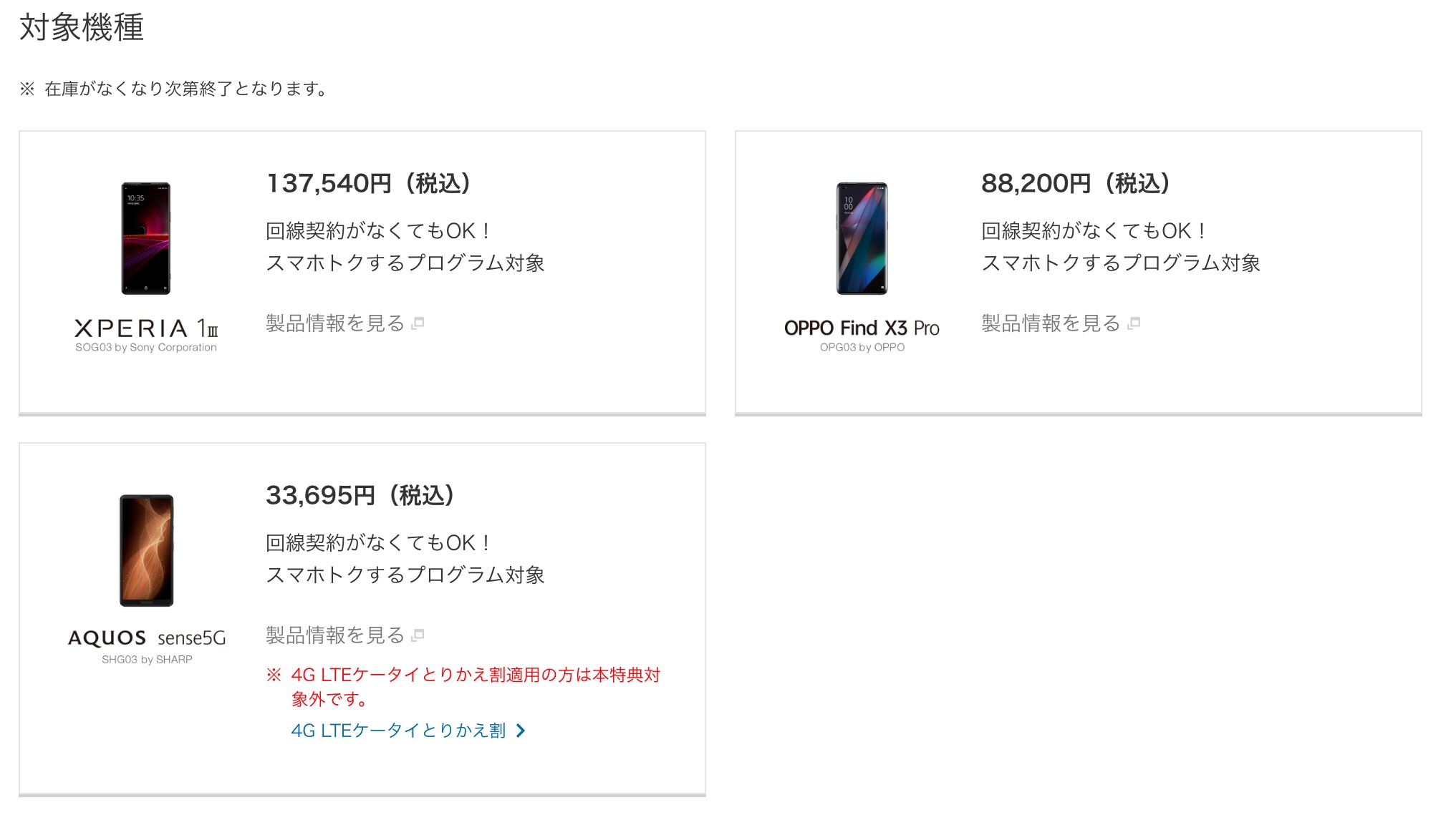 また機種変更では常時実施されている「5G機種変更おトク割」によって5,500円(不課税)相当が還元されるため、合わせて合計20,000円相当が還元されます。対象機種は5Gスマートフォン(スマホ)「Xperia 1 III SOG03」および「OPPO Find X3 Pro OPG03」、「AQUOS sense5G SHG03」の3機種となっています。