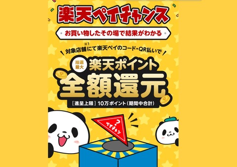 楽天ペイメントは2日、同社が提供するスマートフォン(スマホ)向けアプリ決済サービス「楽天ペイ(アプリ決済)」において抽選で最大全額ポイント還元されるキャンペーン「お買い物したその場で結果がわかる!楽天ペイチャンス」( https://pay.rakuten.co.jp/campaign/2022/0502-paychance/ )を2022年5月2日(月)0:00から5月31日(火)23:59まで実施するとお知らせしています。