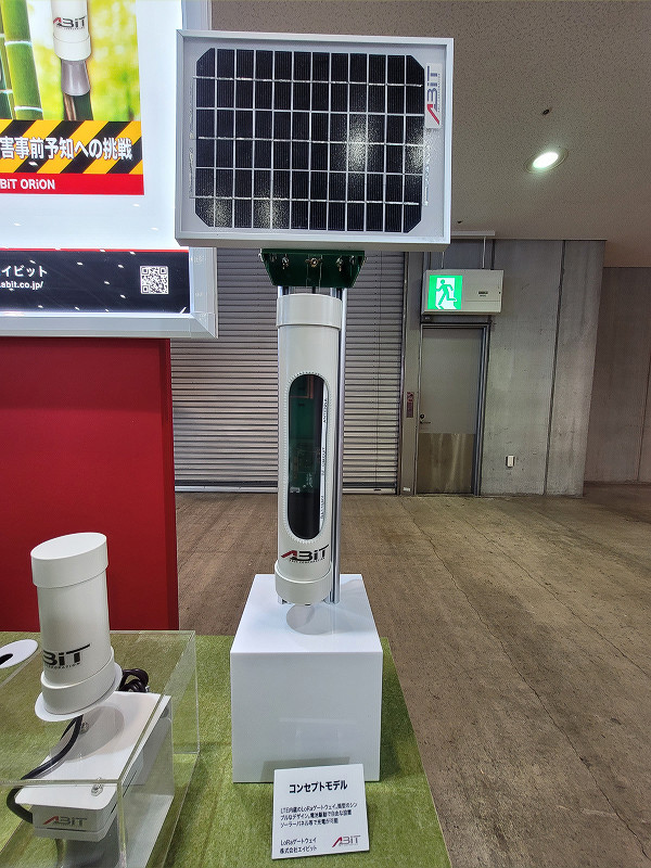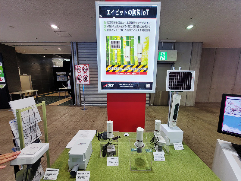 特定小電力無線関連(LPWA)やLTE-M(VoLTEにも対応したIoT向けのナローバンド通信の一種)などを活用した省電力通信技術に強いエイビットの防災関連IoTにも初お目見えの端末が展示されていました。