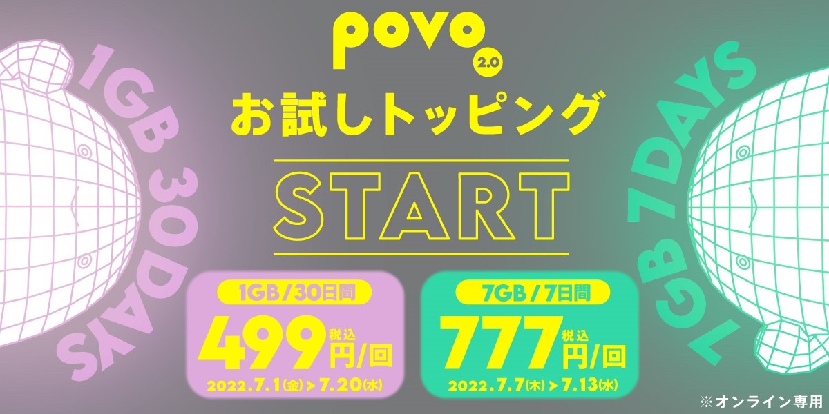 KDDIおよび沖縄セルラー電話は30日、オンライン専用の料金プランとして提供している携帯電話サービス「povo2.0」( https://povo.jp/ )において通常のトッピングとは異なる多様な使い方ができる期間限定のトッピングを提供する「お試しトッピング」を2022年7月1日(金)から開始すると発表しています。