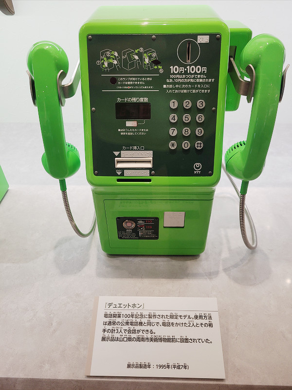 電話開業100周年を記念して製作された限定モデルの公衆電話機で、デュエットフォン側の2名と相手側1名の3人で同時に通話ができるというものです。なんと現行モデルであり、現在でも国内に数台のみ実際に稼働しているということです。