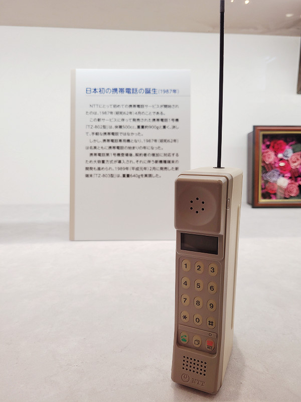 それでは、いよいよ携帯電話の移り変わりを画像で展示するコーナーの紹介です。懐かしいものから、つい最近のものまでが数多く展示されていました。「自動車電話を持ち歩けるようにした」というコンセプトの文字通り、肩からかけて携帯する電話機で、重量が約3kgと非常に重たいものでした。