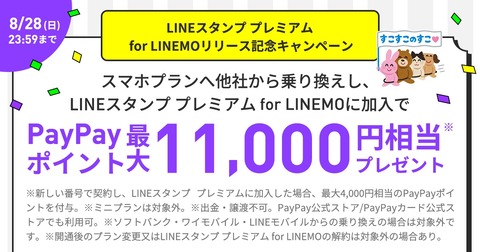 ソフトバンクは9日、オンライン専用の携帯電話ブランド「LINEMO(ラインモ)」において2022年8月9日(火)10:00から8月28日(日)23:59までの期間限定で料金プラン「スマホプラン」を申し込むと最大11,000円相当のPayPayポイントをプレゼントする「LINEスタンププレミアム for LINEMOリリース記念キャンペーン」を実施するとお知らせしています。
