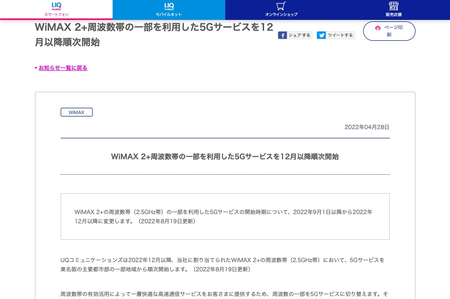 KDDI傘下のUQコミュニケーションズ(以下、UQ)は19日、同社が提供している高速データ通信サービス「WiMAX 2+」に利用している2.5GHz帯(50Hz幅)において今年9月1日以降順次提供開始すると案内していた5Gサービスを2022年12月以降順次に延期するとお知らせしています。