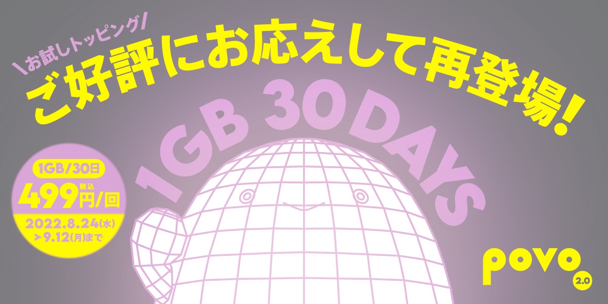 ・povo2.0、「1GB(30日間)499円」トッピングを8月24日から9月12日まで期間限定で復活|基本料ゼロから始めるau回線のスマホプラン【公式】povo2.0