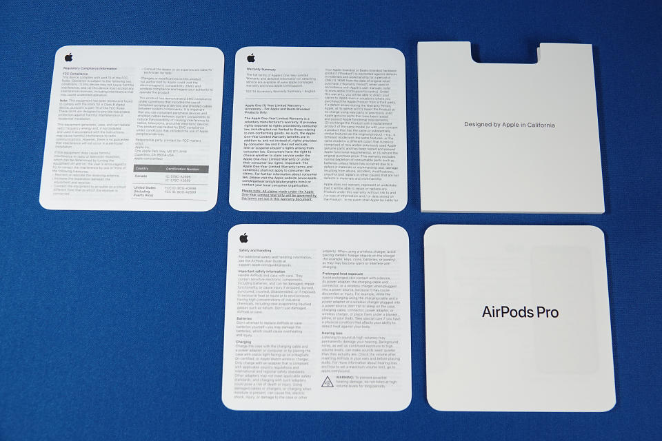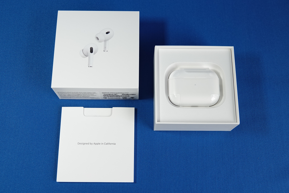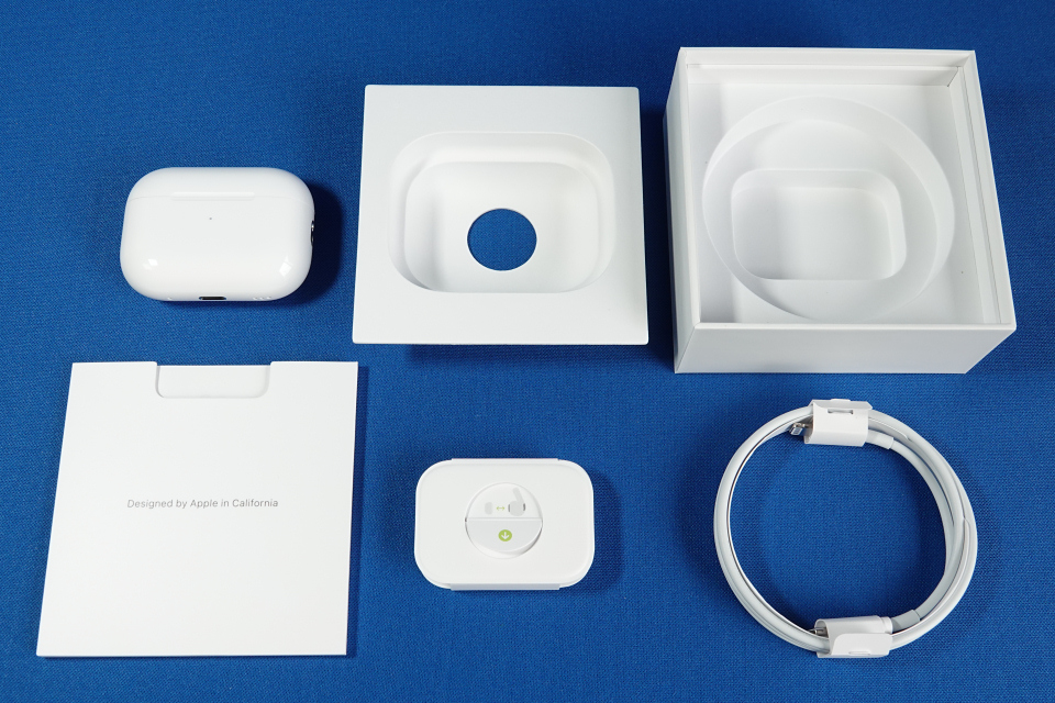 開封すると取扱説明書などが入った薄いケースがあり、その下にAirPods Pro(第2世代)が入っています。さらにAirPods Pro(第2世代)の下には、サイズ調整用の予備イヤーピースとUSB-C接続タイプのLightningケーブルも同梱されています。