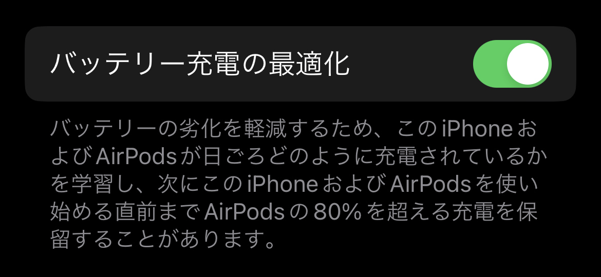 そのため、AirPods(第3世代)および初代AirPods Pro以降は、保管時の充電容量を80%に抑えてバッテリーの劣化を軽減する仕組みも導入されました。