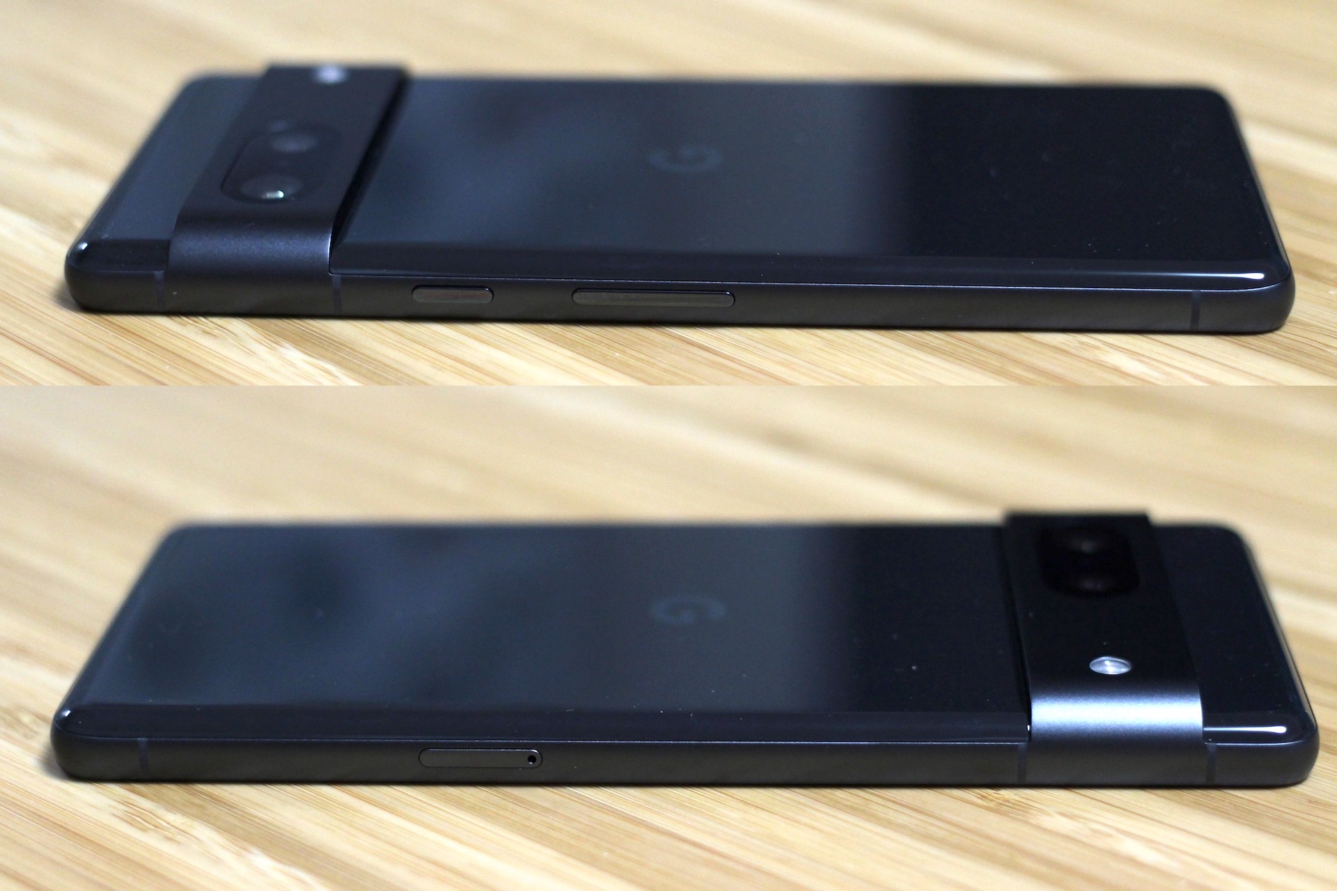 Pixel 7の左右側面。右側には電源/スリープキーや音量上下キー、左側にはnanoSIMカードスロットが配置。アンテナラインも見えます。なお、microSDカードなどの外部ストレージスロットは非搭載です