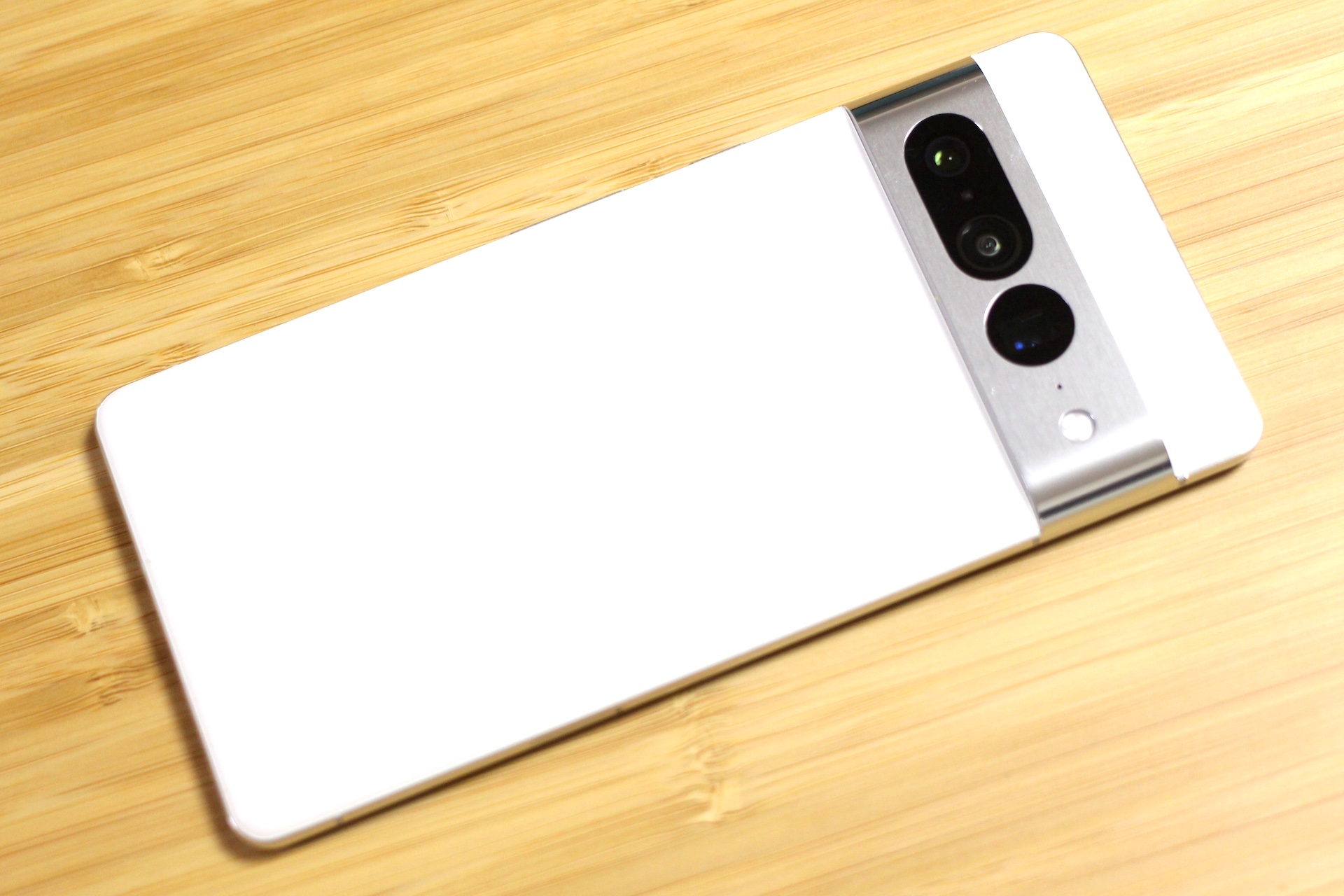 背面は両機種ともに光沢感のあるガラス素材でPixel 6やPixel 6 Proでは強化ガラス「Corning Gorilla Glass 6」でしたが、新たに「Corning Gorilla Glass Victus」となり、左右端がラウンドした形状なため、手にフィットした感じがあるものの、Pixel 6やPixel 6 Proと同じようなサイズ感で、最近のハイエンドスマホとしては厚みがあるように思われ、特にPixel 7 Proはサイズの割に重く感じられます。