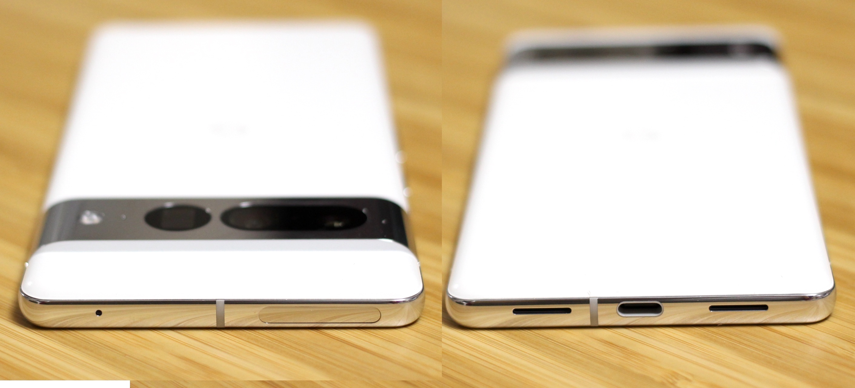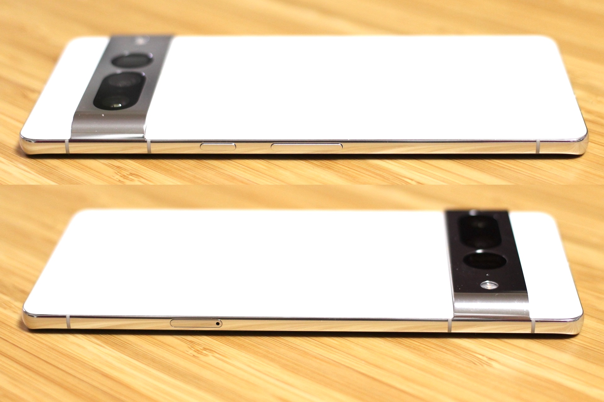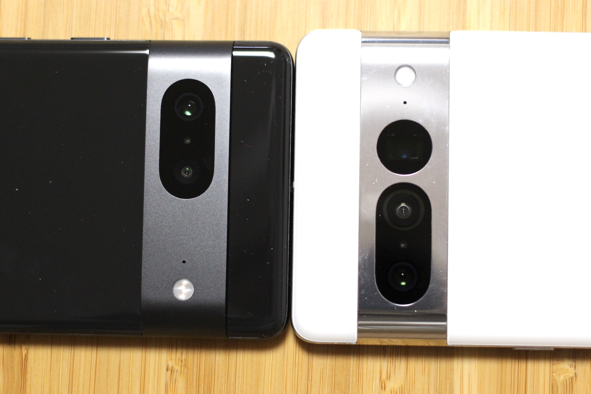 側面フレームはPixel 7がマット仕上げアルミニウム製、Pixel 7 Proがポリッシュ仕上げアルミニウム製、Pixel 6がテクスチャ加工の合金製、Pixel 6 Proがポリッシュ仕上げ合金製となっており、各種キーやSIMカードスロットなどの部品配置は同じです。また本体色は同じ白系でもPixel 7 ProのSnowはPixel 6 ProのCloudy Whiteと比べて真っ白といったところ。なお、本体色はPixel 6がSorta Seafoam、Kinda Coral、Stormy Blackの3色、Pixel 6 ProがSorta Sunny、Cloudy White、Stormy Blackの3色でした。