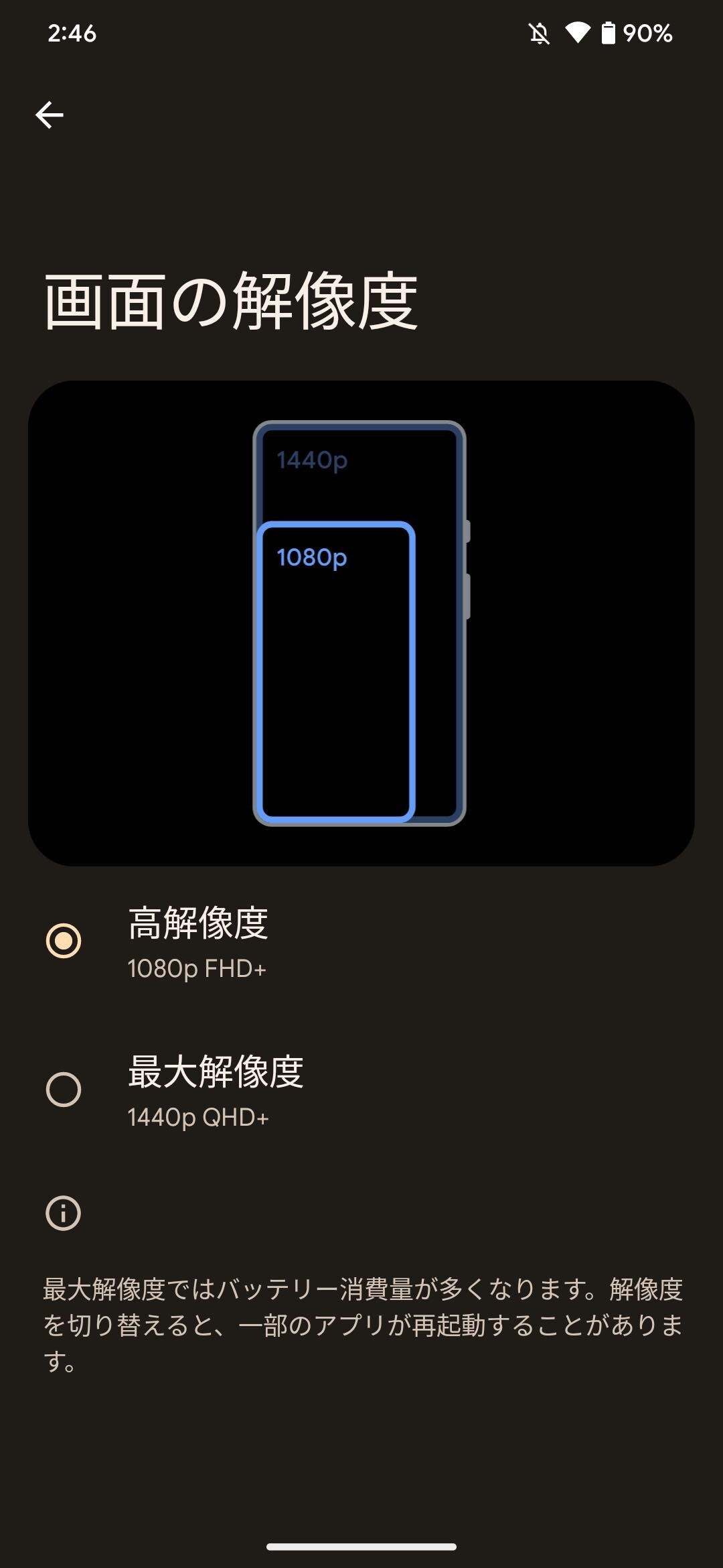 またPixel 7 Proでは画面解像度が設定で変更できるようになっており、初期状態で画面解像度がFHD+(1080×2340ドット)となっています。またPixel 7とPixel 7 Proでは新たに画面の色味の設定(「設定」→「ディスプレイ」→「カラー」)が用意され、自動調整やナチュラルなどが選べるようになっています。