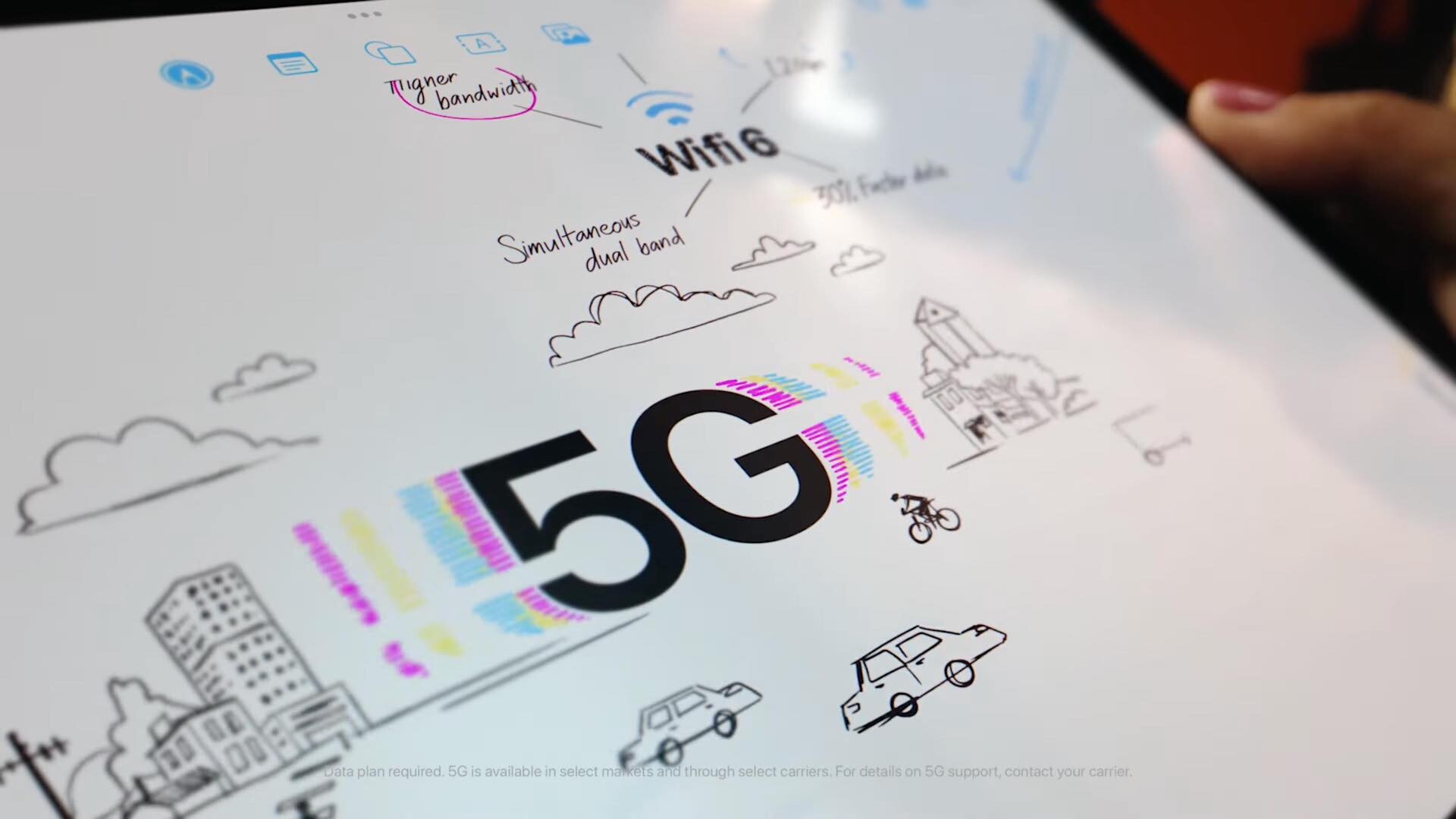 さらに新しい横向きのステレオスピーカーとiPadのより大きなディスプレイの組み合わせによって素晴らしいビデオ視聴体験が実現されています。加えて新たにWi-Fi 6に対応したため、前世代で対応していたWi-Fi 5よりも30%高速となり、5G対応のWi-Fi+Cellularモデルでは最高3.5Gbpsの通信速度を実現します。Wi-Fi+Cellularモデルにおける SIMはnanoSIMカード(4FF)スロットが1つとeSIMに対応しています。日本で販売される製品はWi-Fi+Cellularモデルは型番「A2757」で、携帯電話ネットワークの対応周波数帯は以下の通り。またWi-Fi+CellularモデルではGNSS(GPSなど)による位置情報取得にも対応しています。