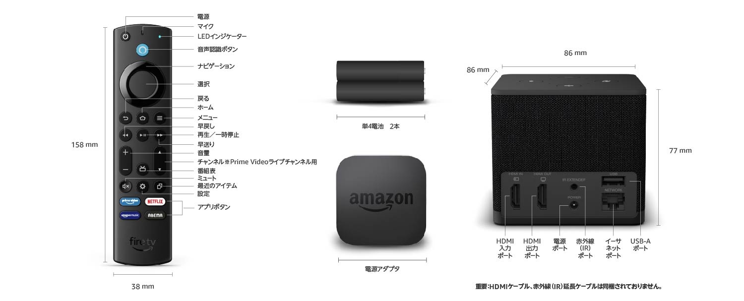 主な仕様はBluetooth 5.0 LEおよび2GB内蔵メモリー(RAM)、16GB内蔵ストレージで、入出力は2160pおよび1080p、720p(ともに最大60fps)に対応し、映像は4K Ultra HDおよびHDR、HDR10、Dolby Vision、HLG、HDR10+をサポートしています。サイズは約86×86×77mm、質量は約513g、本体色はブラックの1色のみ。付属するリモコンのサイズは約38×158×17mm、質量は約51g(電池除く)で、単4乾電池2本で利用します。同梱物はFire TV Cube(第3世代)の本体のほか、Alexa対応音声認識リモコンおよび電源アダプター、単4電池2本(リモコン用)、スタートガイドなどの紙類。