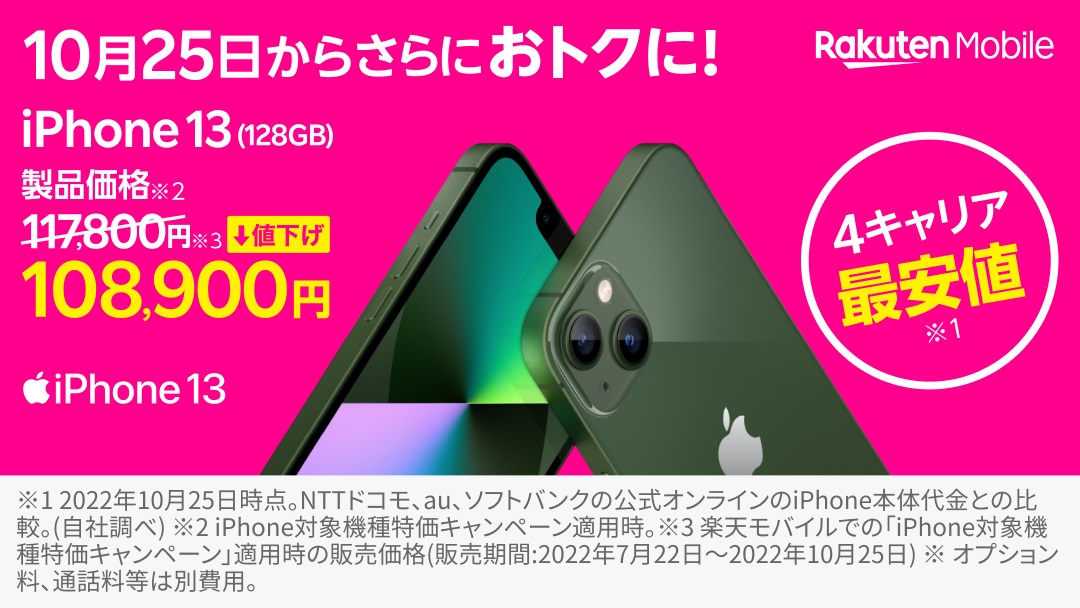楽天モバイルは25日、5G対応スマートフォン(スマホ)「iPhone 13」および「iPhone 13 mini」、「iPhone 12」(ともにApple製)の対象製品について単体購入を含めたすべての購入方法における「iPhone対象機種特価」キャンペーンを適用した販売価格を2022年10月25日(火)9時より改定したとお知らせしています。