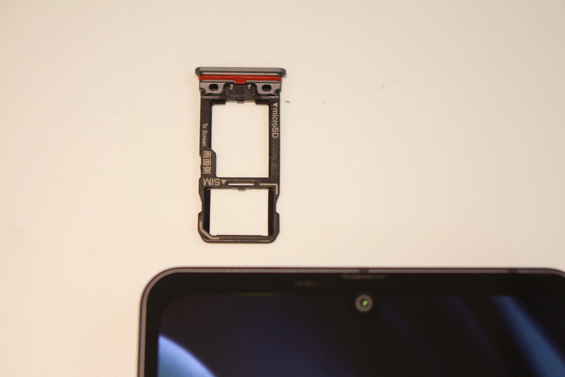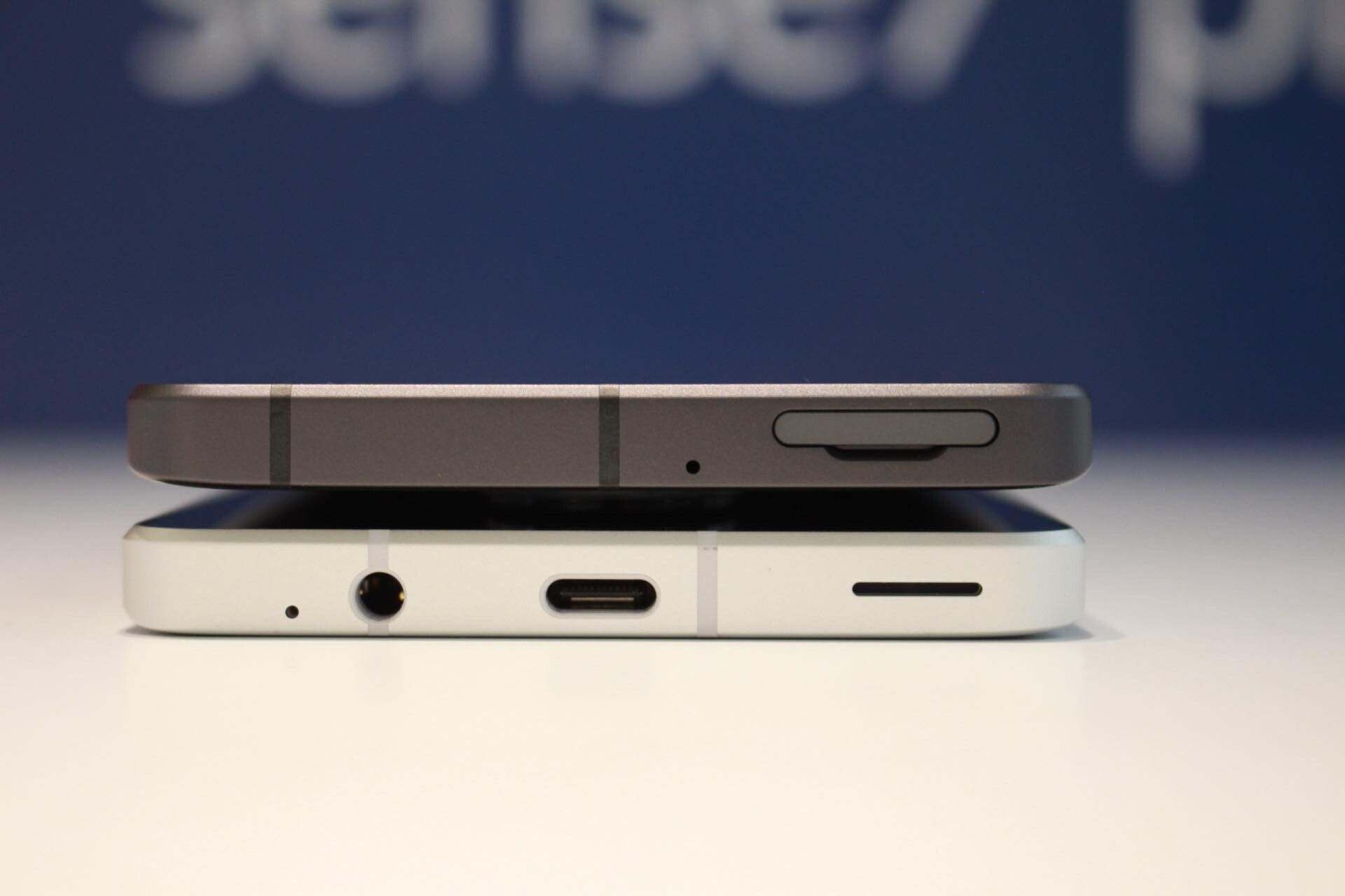 AQUOS sense7 plusの上下側面。上にマイクとカードスロット、下にUSB Type-C端子とスピーカー、3.5mmイヤホンマイク端子、送話口/マイクが配置されています。カードスロットはSIMピンが必要のない爪などで引っ掛けて開けるタイプ