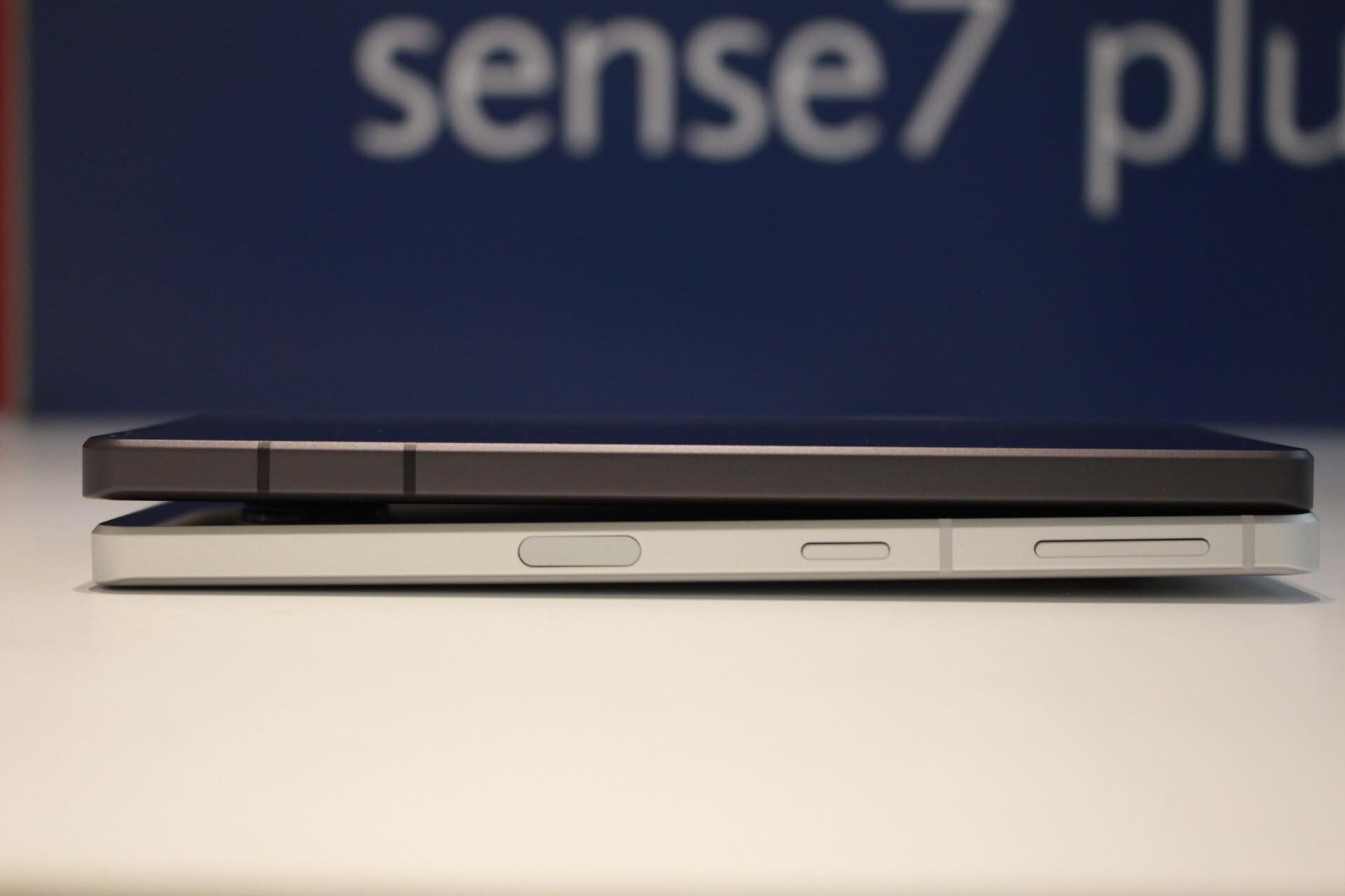 AQUOS sense7 plusの左右側面。左には音量上下キーと電源キー、指紋センサーが配置され、右には何もありません。なお、ここ最近のAQUOSスマホで採用していた中央が凹んだ側面フレームは廃止され、フラットとなっています