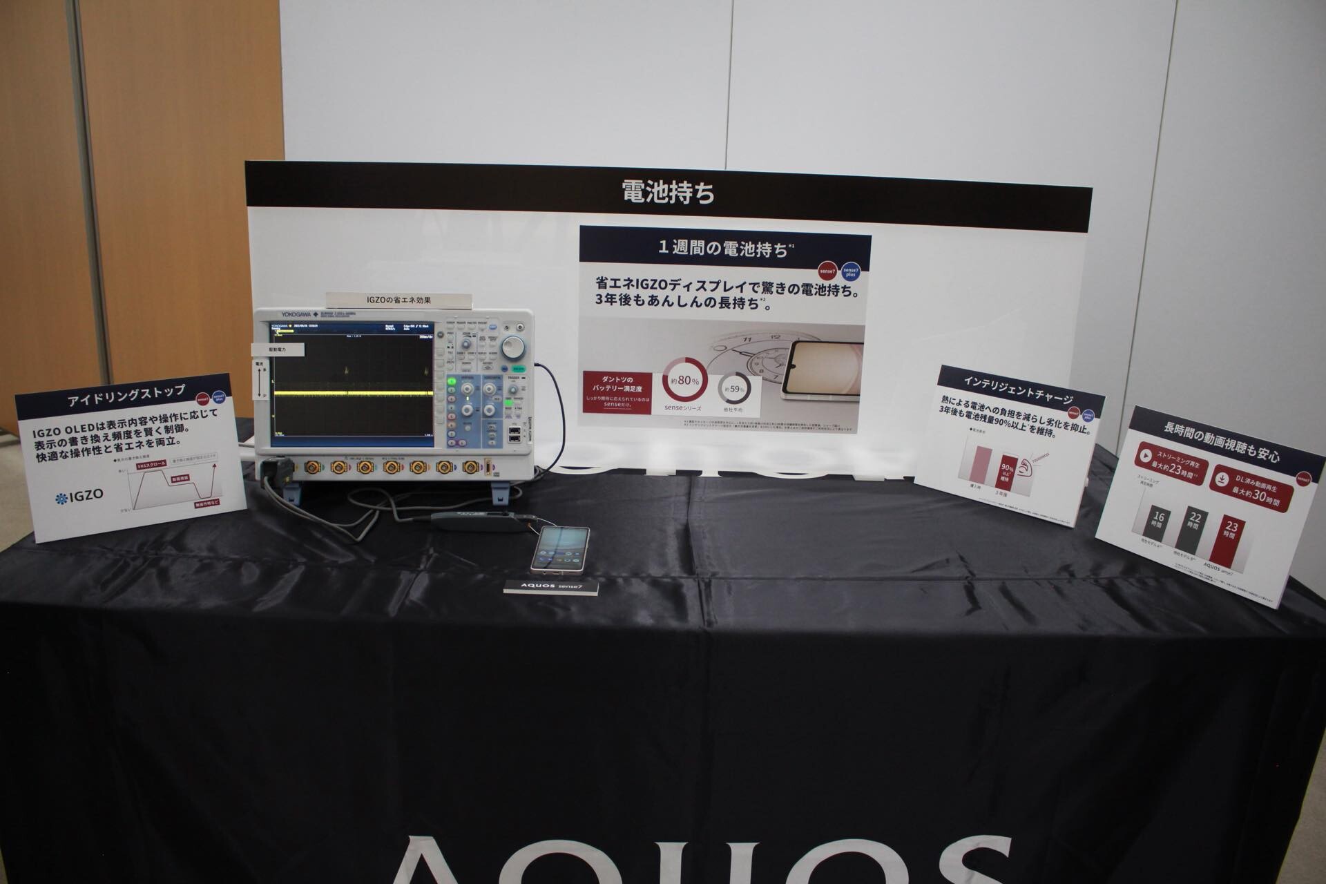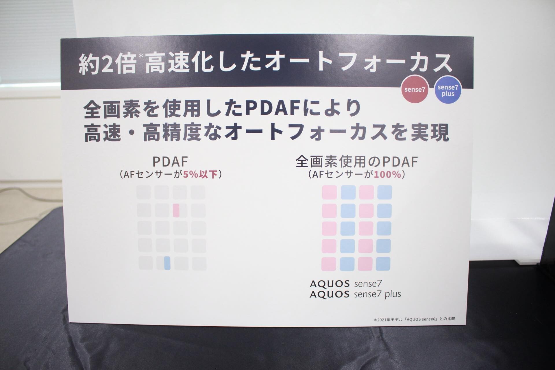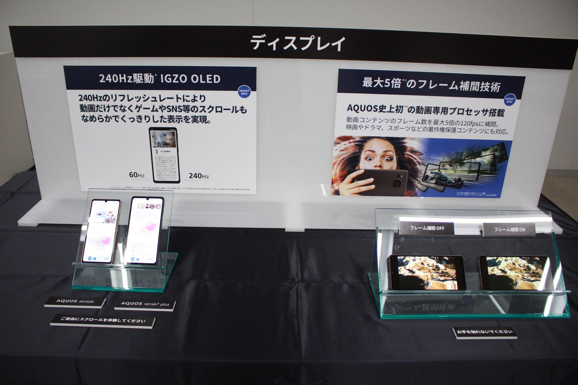 シャープではカメラの次に利用頻度が高い動画視聴やゲームプレイなどを挙げ、AQUOS sense7 plusでは画面の大きさがAQUOS sense7の6.1インチからAQUOS sense7 plusでは6.4インチに大型化しているほか、残像低減処理を含めて最大240Hz相当のリフレッシュレートに対応したことに加え、AQUOSスマホ初の動画専用プロセッサーを搭載して動画のフレーム補間に対応しているため、非常に滑らかな表示が可能となっています。