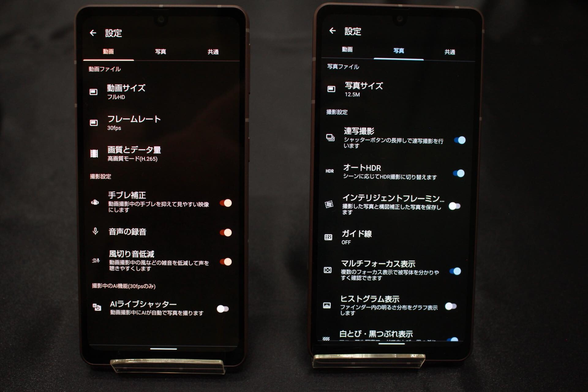 またAQUOSスマホでは史上初の動画専用プロセッサーを搭載しており、動画配信サービス「YouTube」や「Netflix」などで最大5倍の120fpsにフレームを補間する機能に対応し、著作権保護がされているコンテンツにも対応しているため、滑らかな描写でスポーツやライブをより一層リアルに楽しめるとのこと。ディスプレイの画質は「おススメ」および「標準」、「ダイナミック」、「ナチュラル」から選択可能。