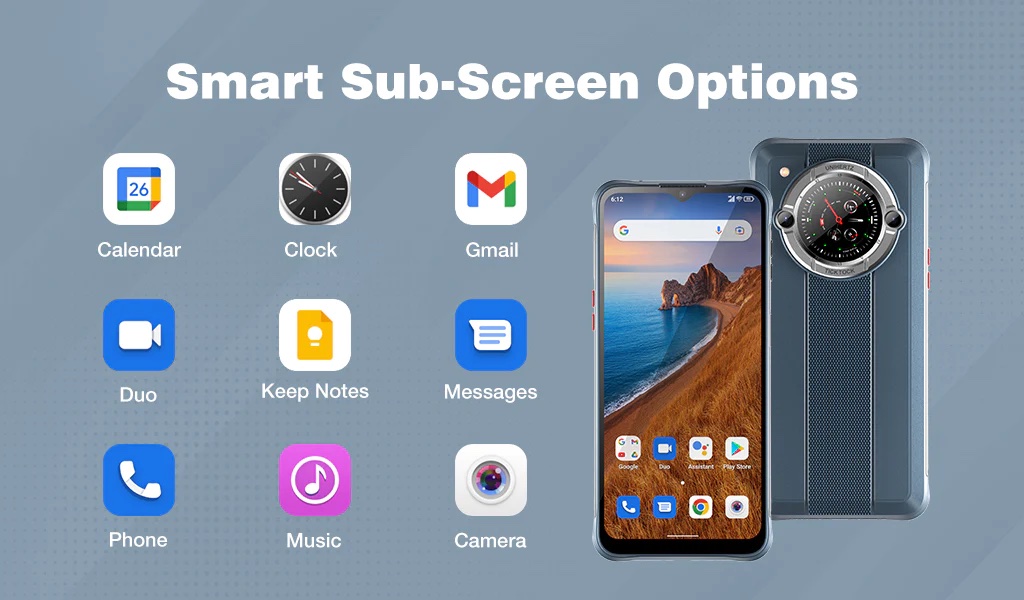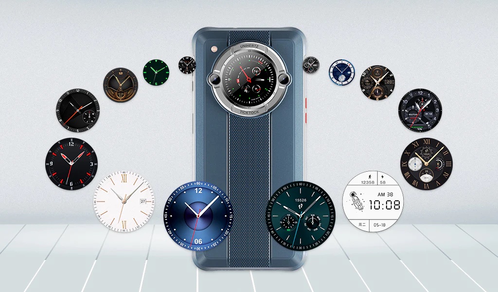 特徴はUnihertz TickTockと同じく背面にタッチ操作対応ラウンドサブディスプレイが搭載され、通知の確認やお気に入りの写真の表示などができるようになっている点です。ただし、背面ディスプレイはUnihertz TickTockでは約1.3インチ360×360ドットでしたが、Unihertz TickTock-Eでは約1.28インチ240×240ドットに変更されています。