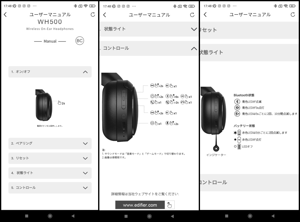 「ユーザーマニュアル」では、前述の同梱品マニュアル(取扱説明書)同様、「オン/オフ」「ペアリング」「リセット」「状態ライト」「コントロール」の5つの項目の説明を閲覧できる。それぞれの項目をタップして表示を開いたり閉じたりでき、画面をピンチイン/アウトすることで表示の拡大および縮小が可能。